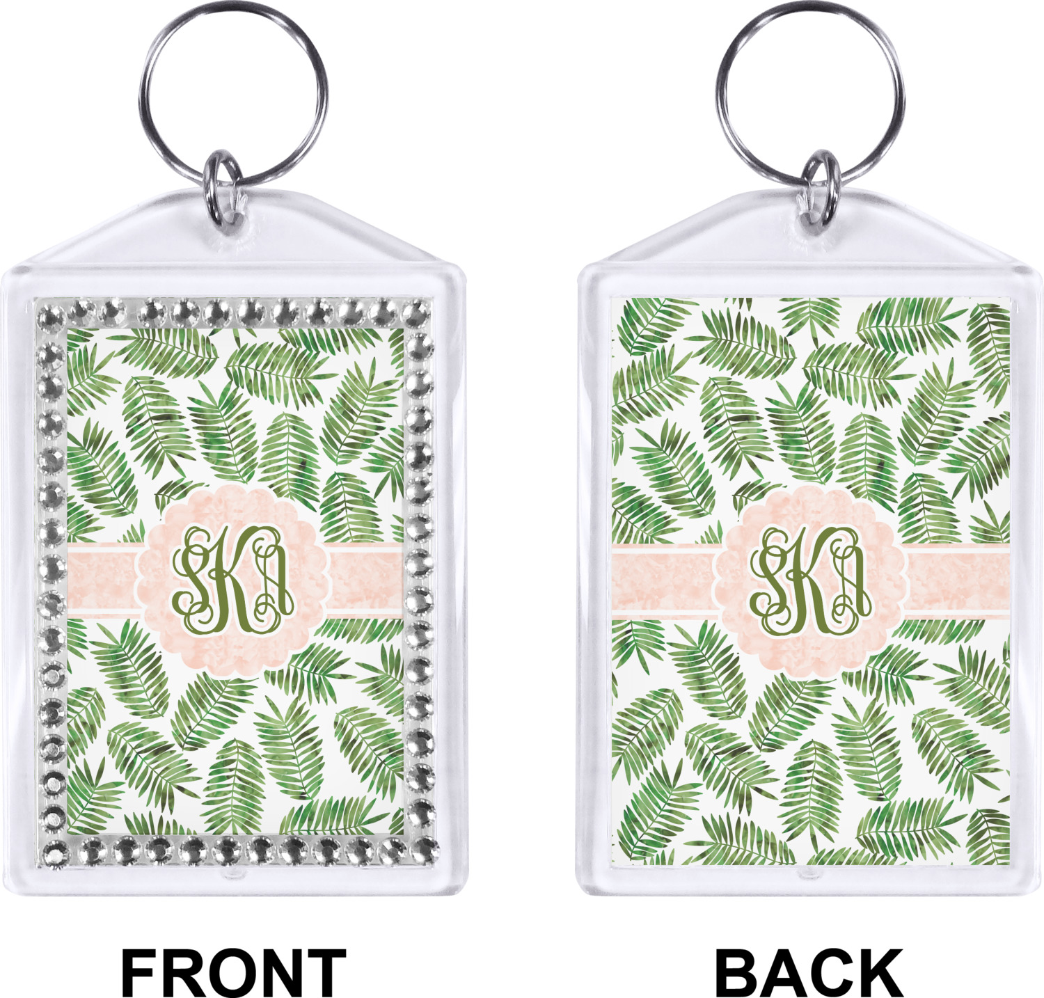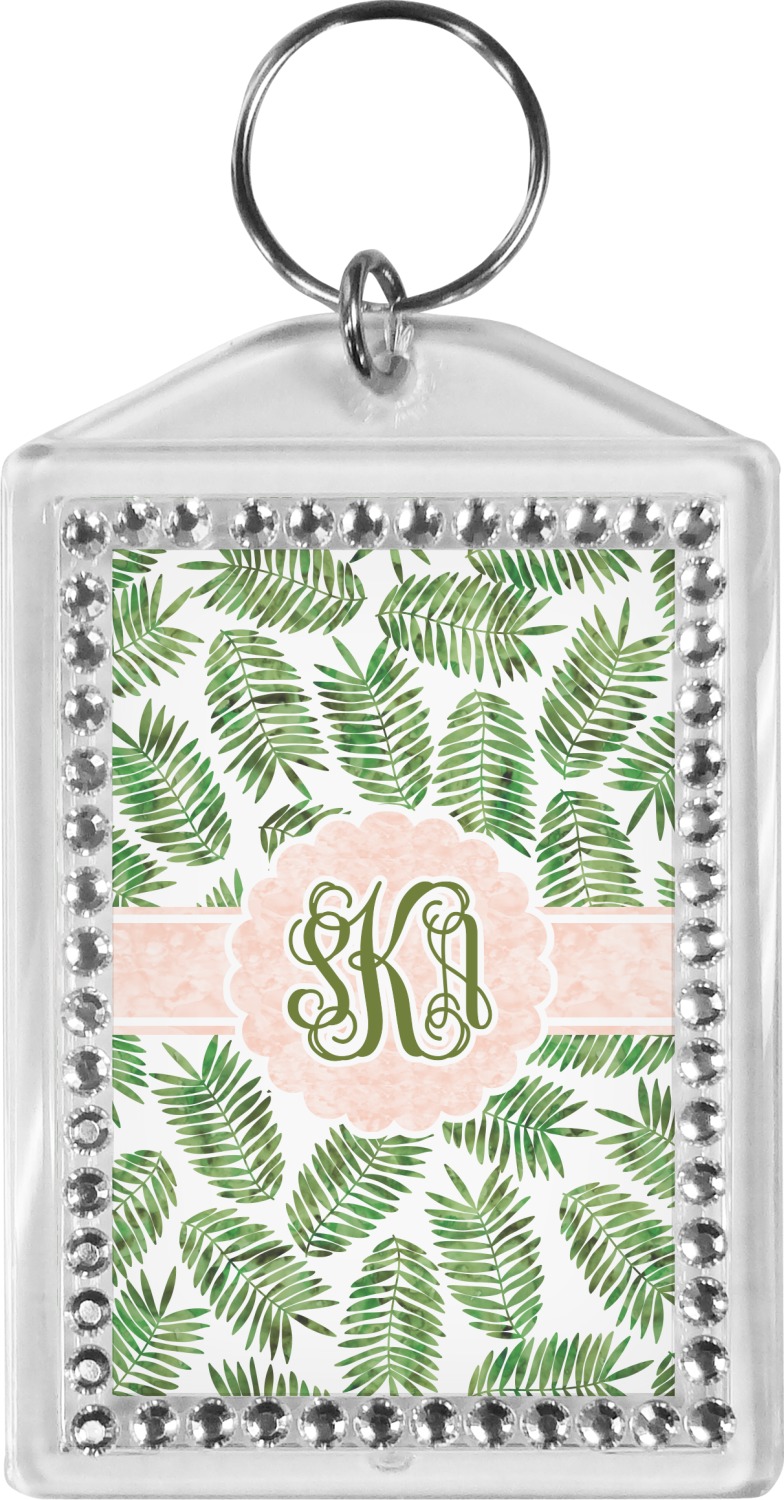 Our personalized keychains have a bold, rectangular shape, outlined by a series of shimmering rhinestones. A metal, split keyring is included with your purchase, and an additional metal hoop allows for attachment of the keychain to the split ring. This unique keychain measures at about 3.75 by 2.5 inches. We print your customized design(s) across both the back and front of this keychain.