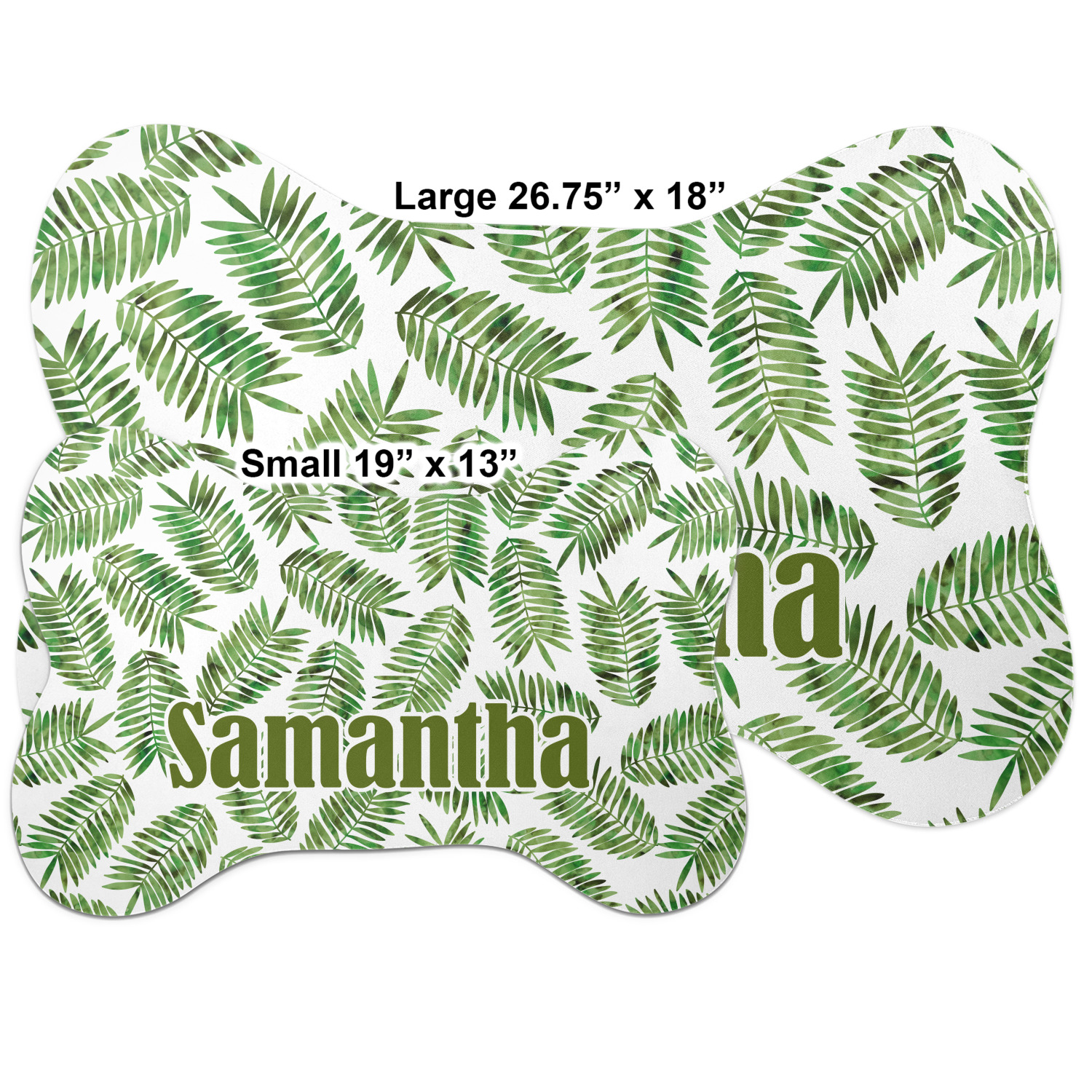 The top of this mat displays your custom design, as it is printed on polyester. To prevent slippage, the underside of the mat is made of rubber. We offer a small dog food mat, suitable for smaller dogs and a large dog food mat for bigger breeds. The small dog food mat is approximately 19 by 13 inches, while the large dog feeding mat measures at approximately 26.75 by 18 inches. Both personalized mats are ideally sized to fit two dog bowls.
