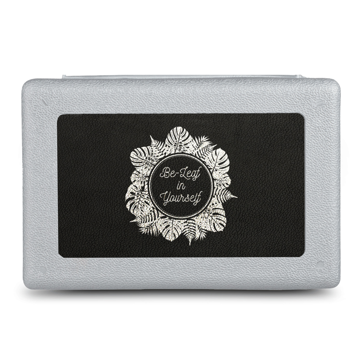 This design has a calming light green background. The foreground is filled with pops of dark green, lime, yellow, and a soft red. The tropical leaves really pop out at you as if they were real. The leaves are in a border or frame sort of formation surrounding a name and initial. This is a gorgeous design that looks a little bit different on each product it is on.