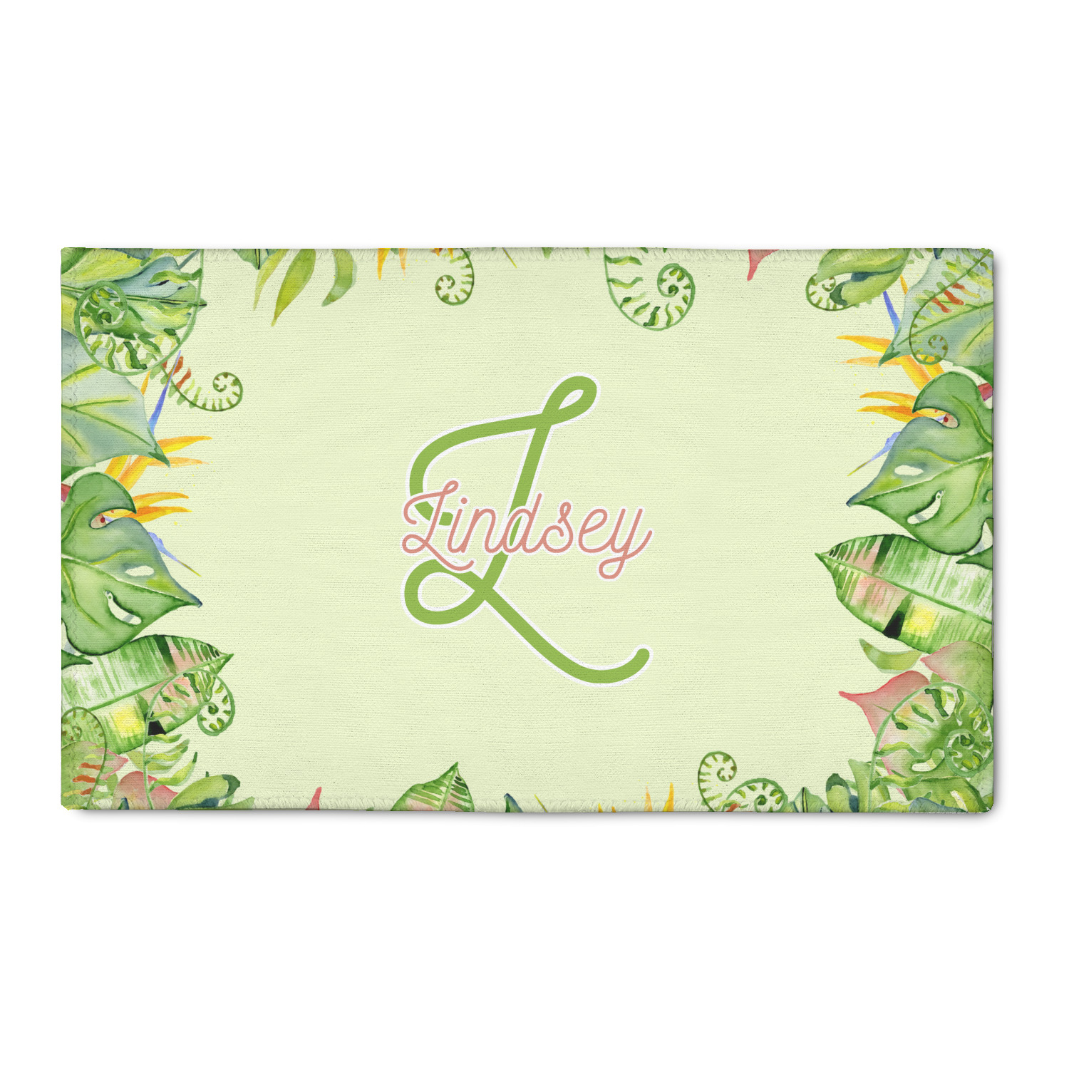 This design has a calming light green background. The foreground is filled with pops of dark green, lime, yellow, and a soft red. The tropical leaves really pop out at you as if they were real. The leaves are in a border or frame sort of formation surrounding a name and initial. This is a gorgeous design that looks a little bit different on each product it is on.