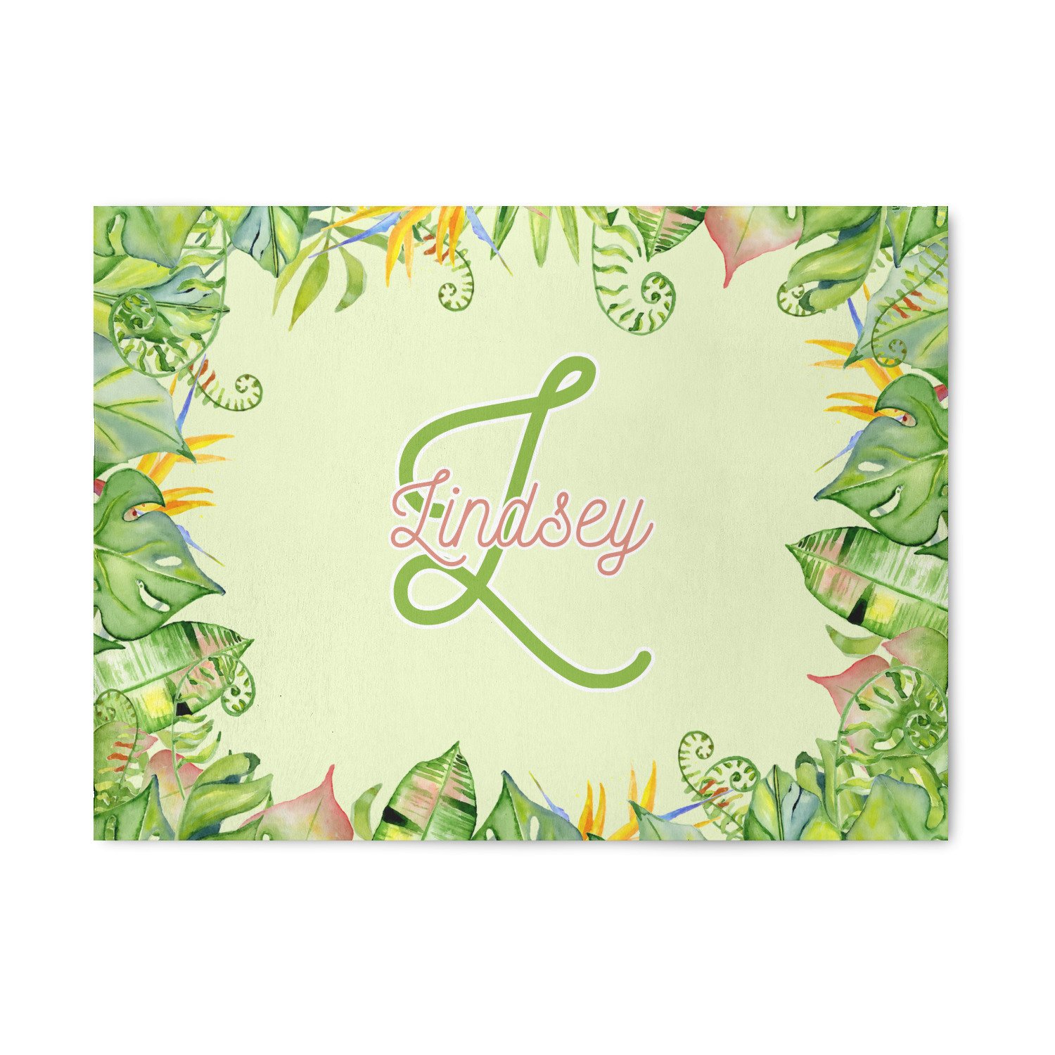 This design has a calming light green background. The foreground is filled with pops of dark green, lime, yellow, and a soft red. The tropical leaves really pop out at you as if they were real. The leaves are in a border or frame sort of formation surrounding a name and initial. This is a gorgeous design that looks a little bit different on each product it is on.