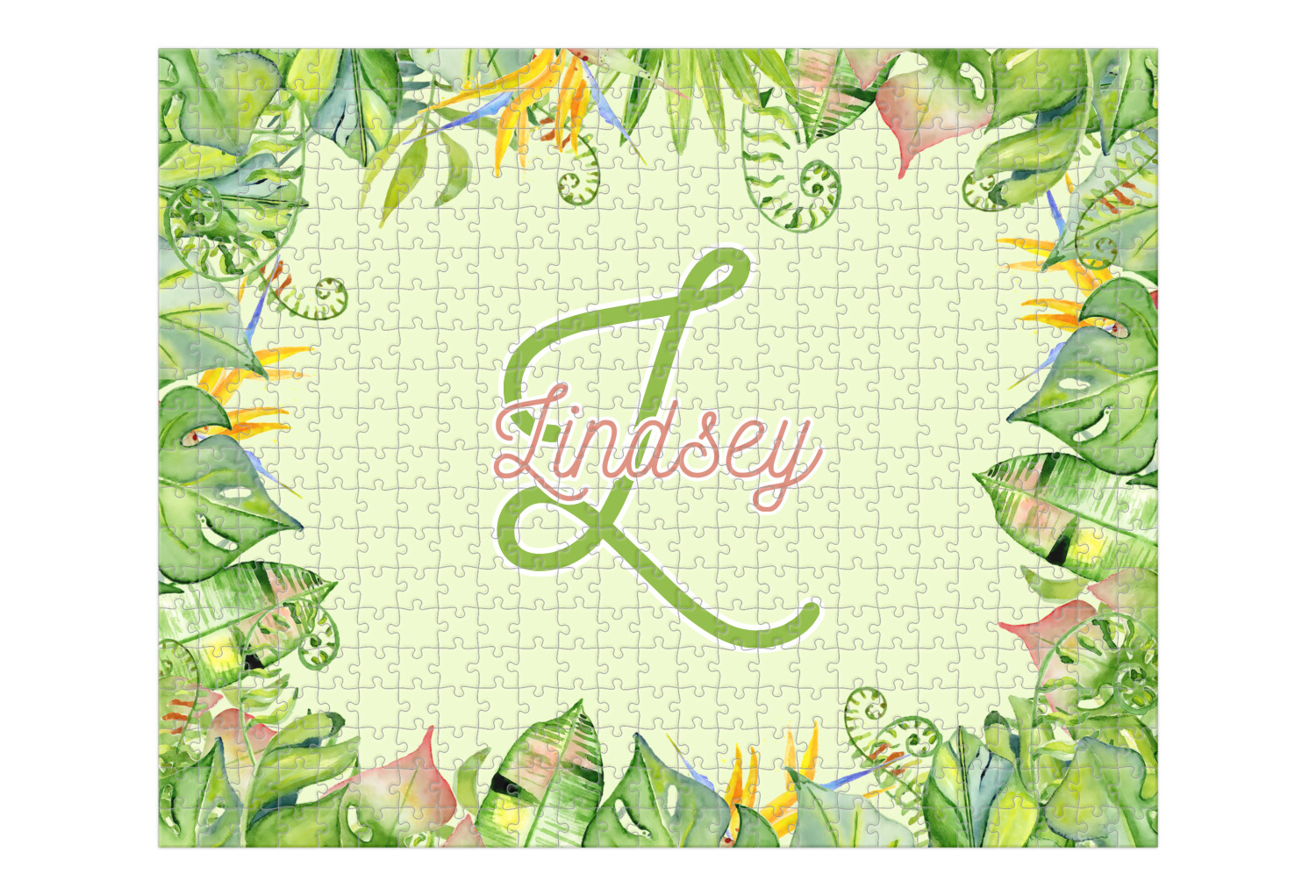 This design has a calming light green background. The foreground is filled with pops of dark green, lime, yellow, and a soft red. The tropical leaves really pop out at you as if they were real. The leaves are in a border or frame sort of formation surrounding a name and initial. This is a gorgeous design that looks a little bit different on each product it is on.