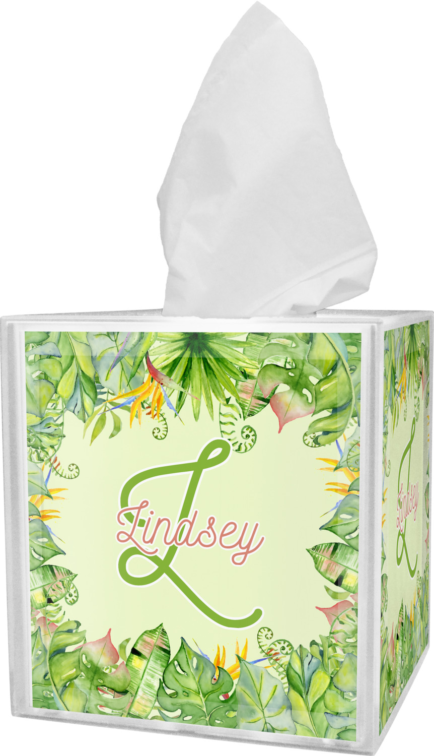 These tissue holders are built from durable acrylic and display your unique personalization on fine-quality vinyl inserts placed within the four sides and top. The box features two pieces, allowing you to easily switch out tissue boxes. On the sides, you'll find ridges that ensure the top and base fit securely in place. The bottom of these tissue box holders has four, rubber, non-slip pads to prevent the box from scuffing any surface you decide to display it on. Each box can fit a standard 5-by-5-inch box of tissues.