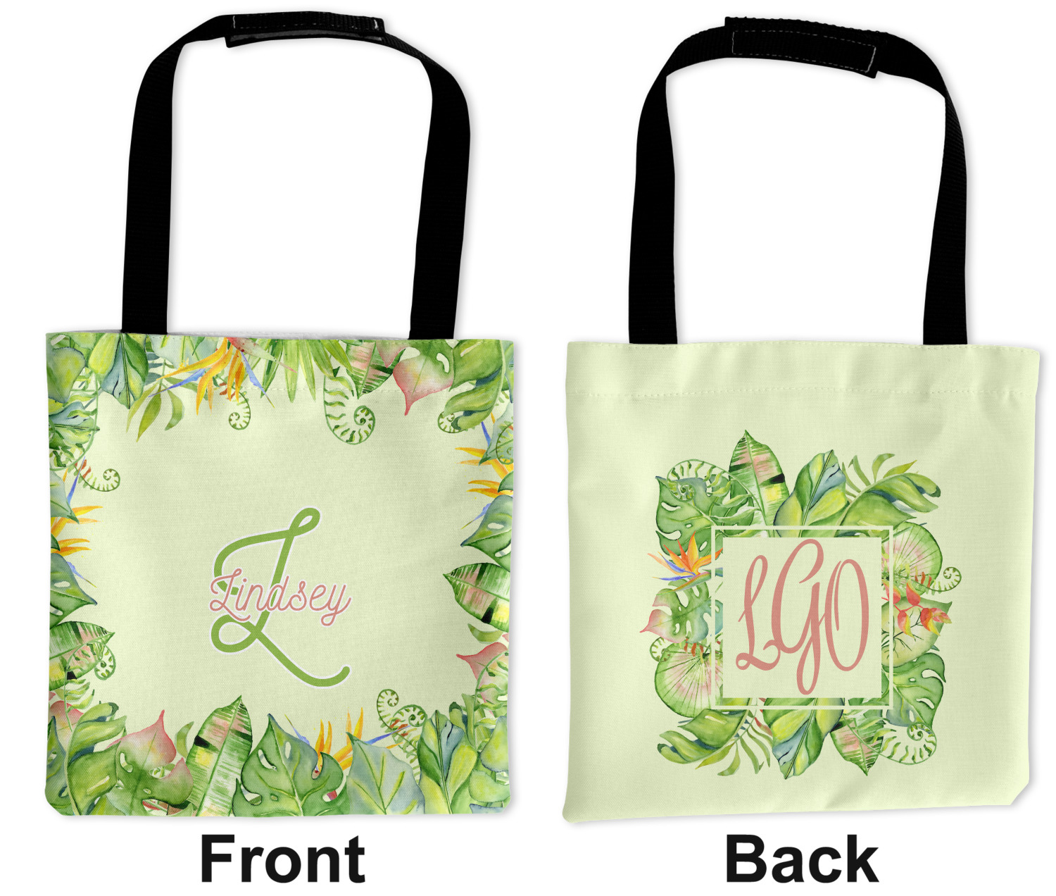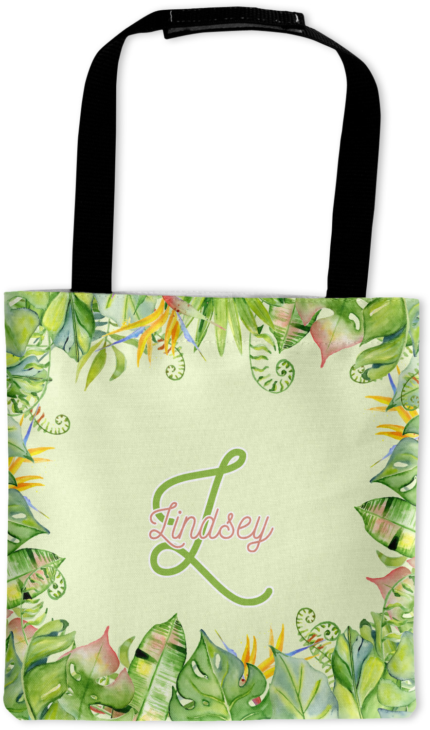 This design has a calming light green background. The foreground is filled with pops of dark green, lime, yellow, and a soft red. The tropical leaves really pop out at you as if they were real. The leaves are in a border or frame sort of formation surrounding a name and initial. This is a gorgeous design that looks a little bit different on each product it is on.