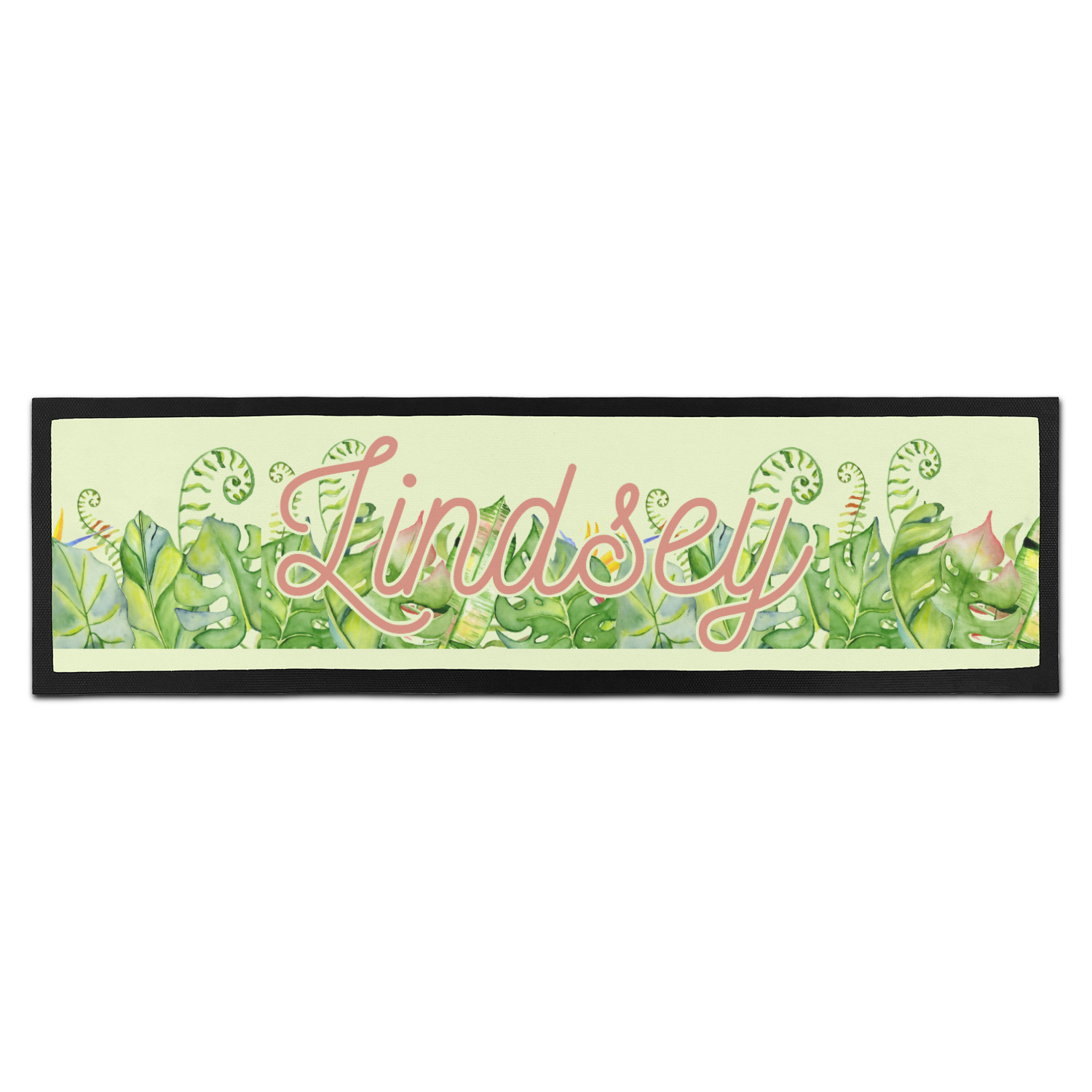 This design has a calming light green background. The foreground is filled with pops of dark green, lime, yellow, and a soft red. The tropical leaves really pop out at you as if they were real. The leaves are in a border or frame sort of formation surrounding a name and initial. This is a gorgeous design that looks a little bit different on each product it is on.