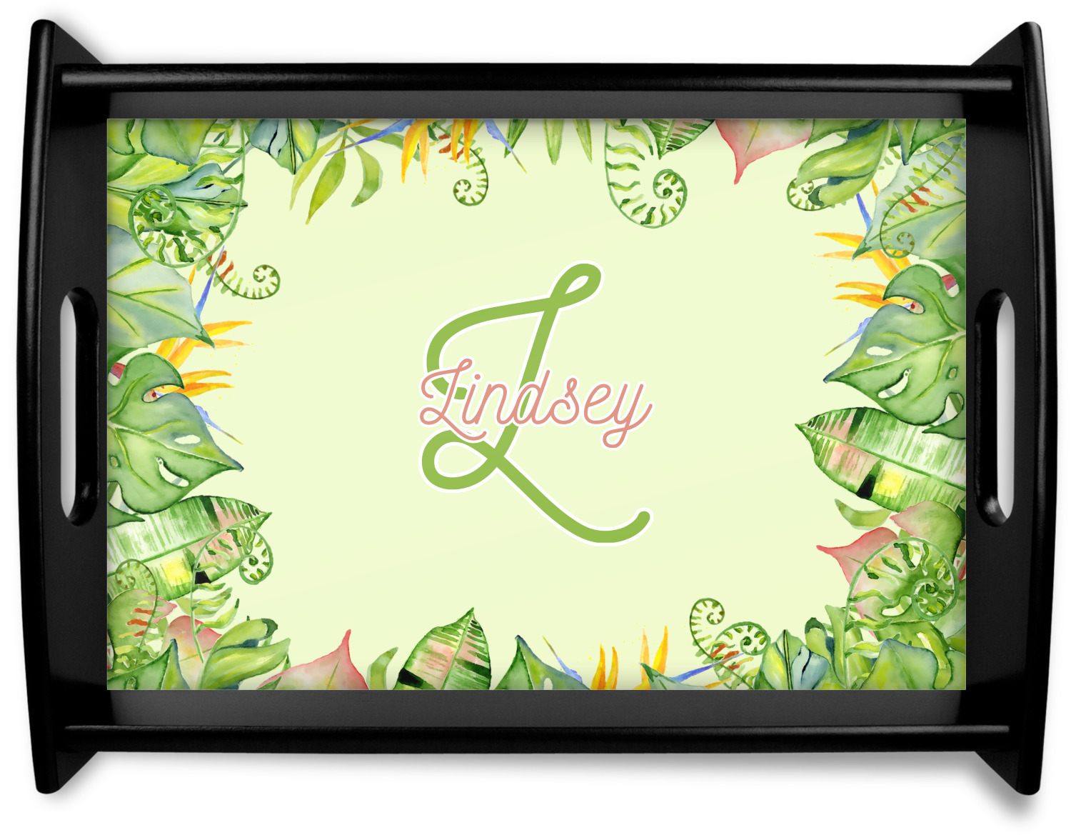 This design has a calming light green background. The foreground is filled with pops of dark green, lime, yellow, and a soft red. The tropical leaves really pop out at you as if they were real. The leaves are in a border or frame sort of formation surrounding a name and initial. This is a gorgeous design that looks a little bit different on each product it is on.