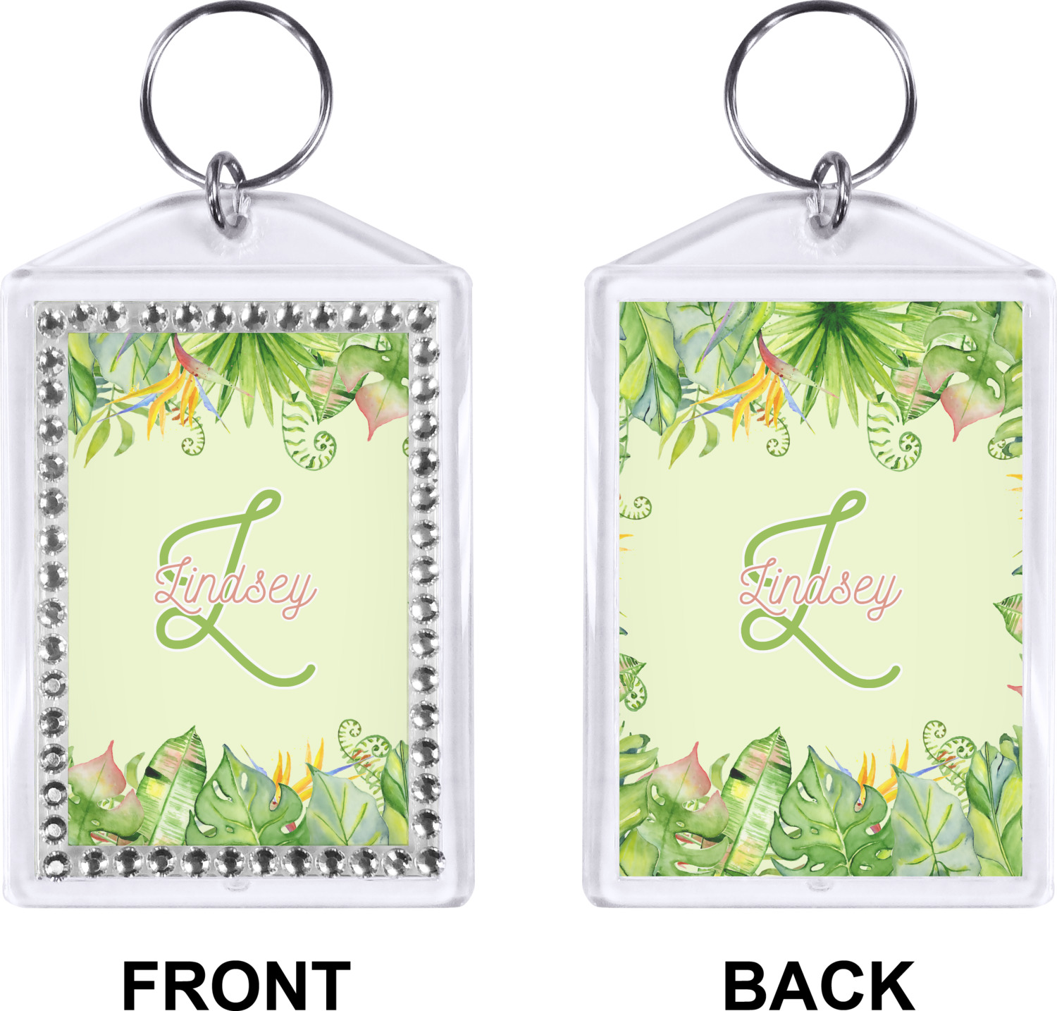 Our personalized keychains have a bold, rectangular shape, outlined by a series of shimmering rhinestones. A metal, split keyring is included with your purchase, and an additional metal hoop allows for attachment of the keychain to the split ring. This unique keychain measures at about 3.75 by 2.5 inches. We print your customized design(s) across both the back and front of this keychain.