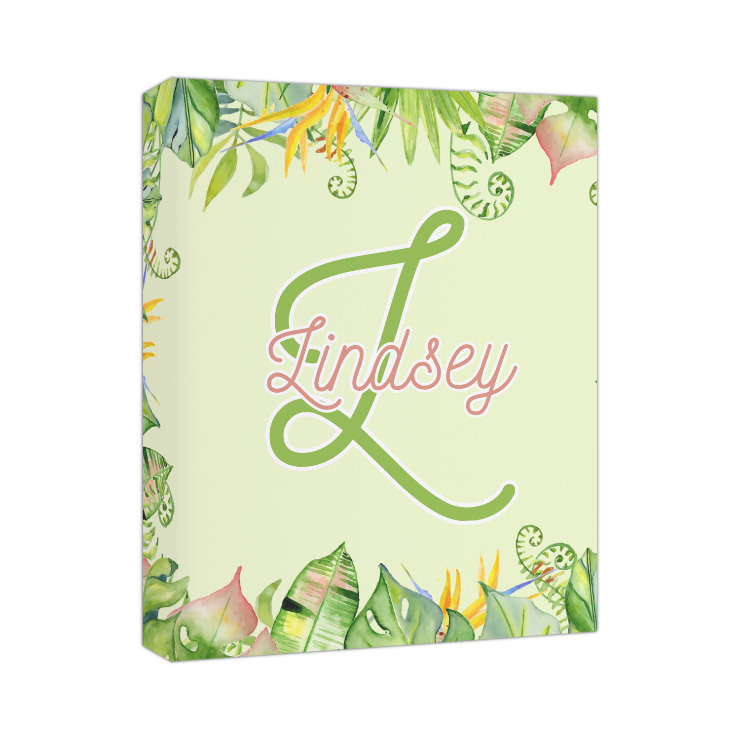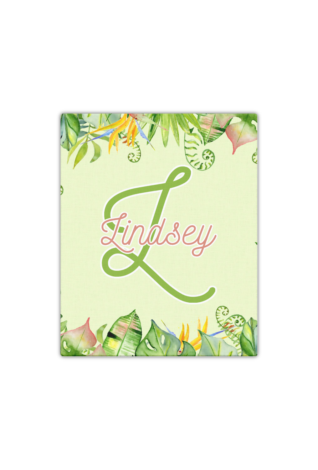 This design has a calming light green background. The foreground is filled with pops of dark green, lime, yellow, and a soft red. The tropical leaves really pop out at you as if they were real. The leaves are in a border or frame sort of formation surrounding a name and initial. This is a gorgeous design that looks a little bit different on each product it is on.