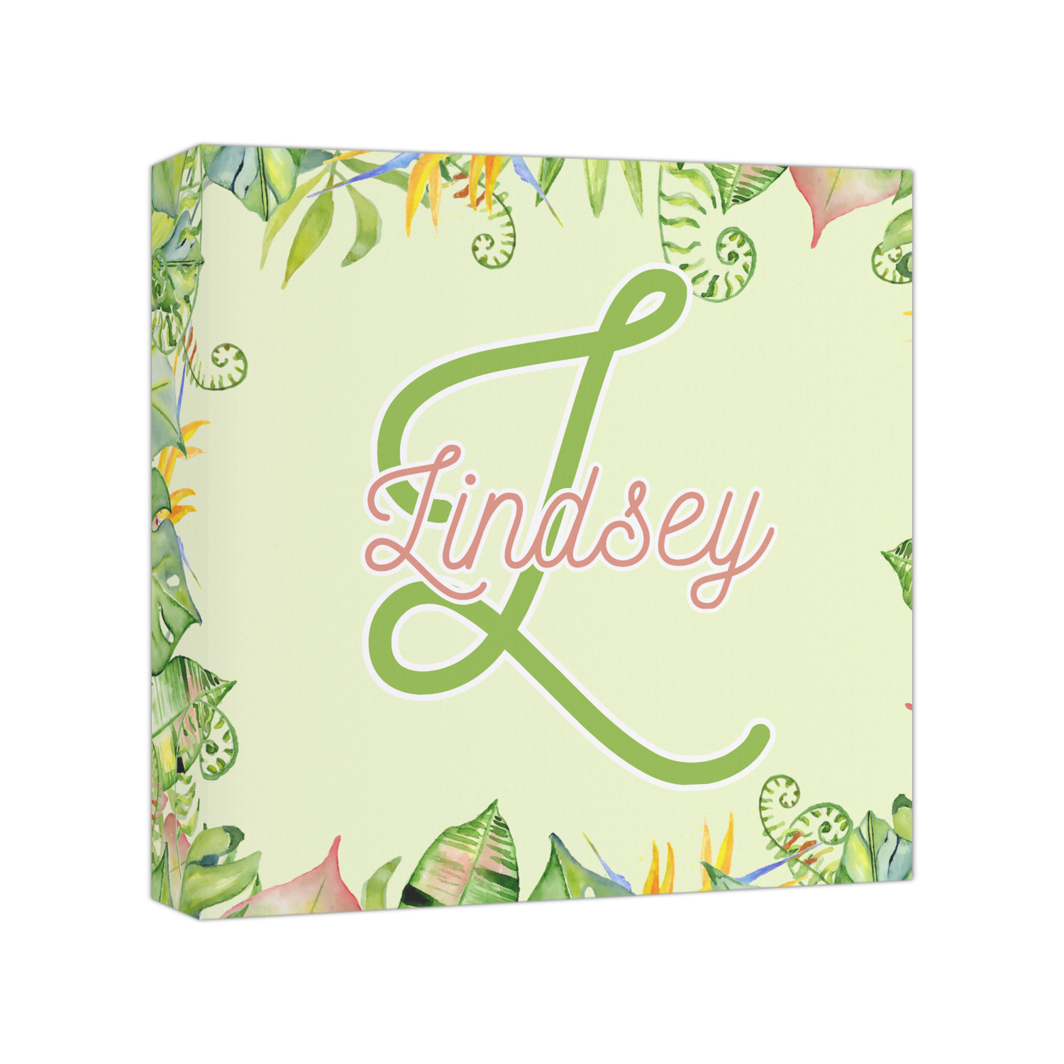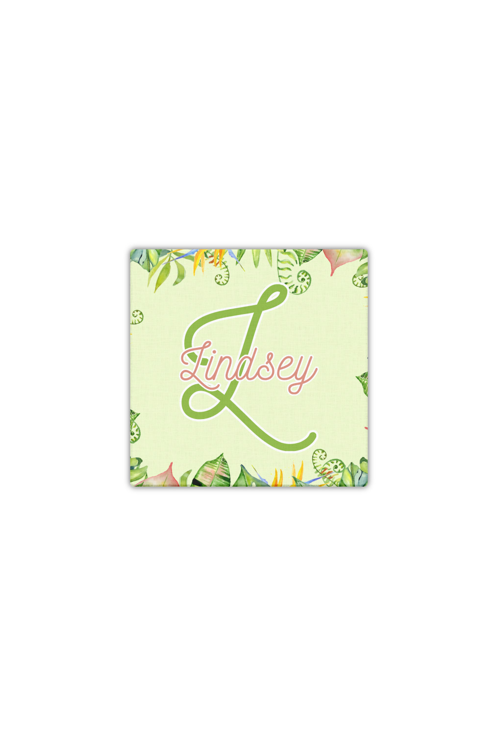 This design has a calming light green background. The foreground is filled with pops of dark green, lime, yellow, and a soft red. The tropical leaves really pop out at you as if they were real. The leaves are in a border or frame sort of formation surrounding a name and initial. This is a gorgeous design that looks a little bit different on each product it is on.