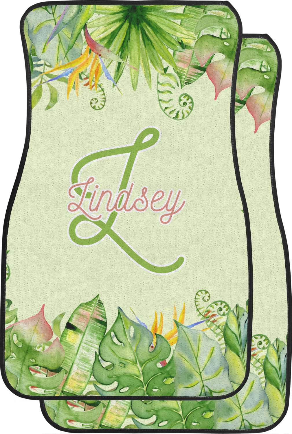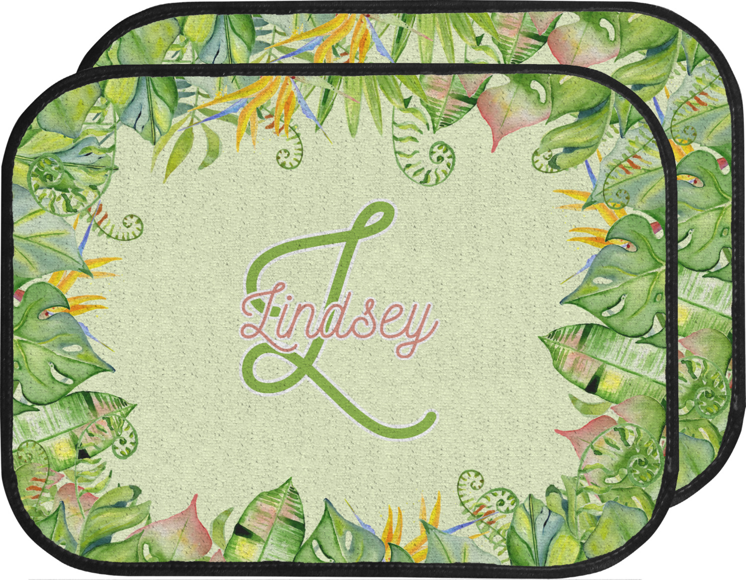 This design has a calming light green background. The foreground is filled with pops of dark green, lime, yellow, and a soft red. The tropical leaves really pop out at you as if they were real. The leaves are in a border or frame sort of formation surrounding a name and initial. This is a gorgeous design that looks a little bit different on each product it is on.