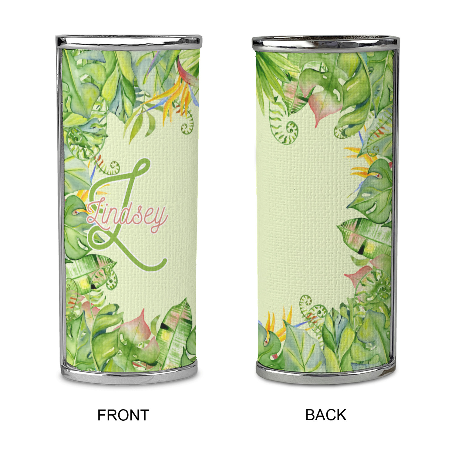 This design has a calming light green background. The foreground is filled with pops of dark green, lime, yellow, and a soft red. The tropical leaves really pop out at you as if they were real. The leaves are in a border or frame sort of formation surrounding a name and initial. This is a gorgeous design that looks a little bit different on each product it is on.