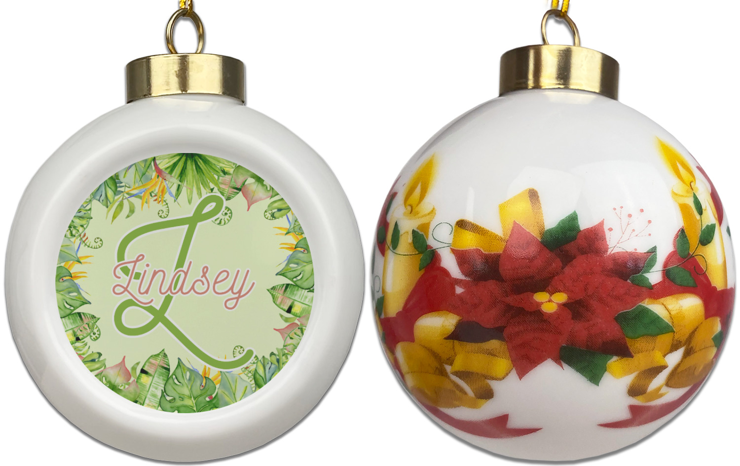 Our Christmas ornaments are a unique ceramic ball shape with a twist as it has a flat face to display your custom design! Select from one of our two design types - Christmas Tree or Poinsettia Garland - to adorn the curved back of your personal design. Each ornament measures 3H x 2.5W x 2D accompanied with a gold string accent for finishing touches to hang on your beautiful Christmas tree!