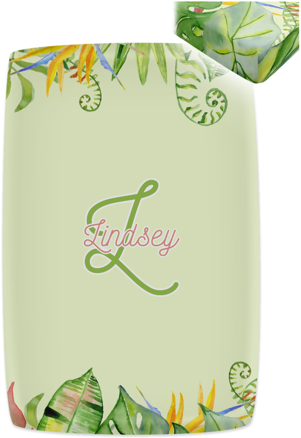 This design has a calming light green background. The foreground is filled with pops of dark green, lime, yellow, and a soft red. The tropical leaves really pop out at you as if they were real. The leaves are in a border or frame sort of formation surrounding a name and initial. This is a gorgeous design that looks a little bit different on each product it is on.