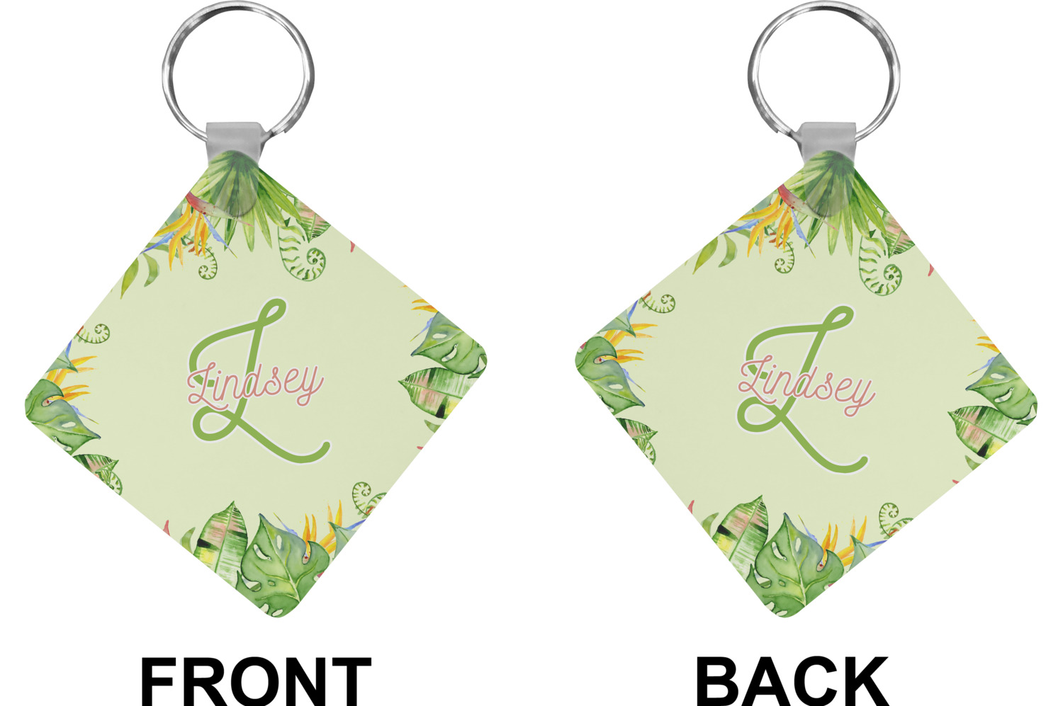 Our personalized keychains attach to the included metal, split key ring with a plastic, removable snap. Since a metal ring is included with your purchase, you have the liberty to keep your keys together on the ring, with or without your unique keychain. We offer this keychain in three different shapes: circle, heart, or diamond. We print your personalized design(s) on both sides of the key chain, and the surface has a glossy, reflective finish that only emphasizes your design. Each keychain is approximately 2.25 by 2.25 inches.