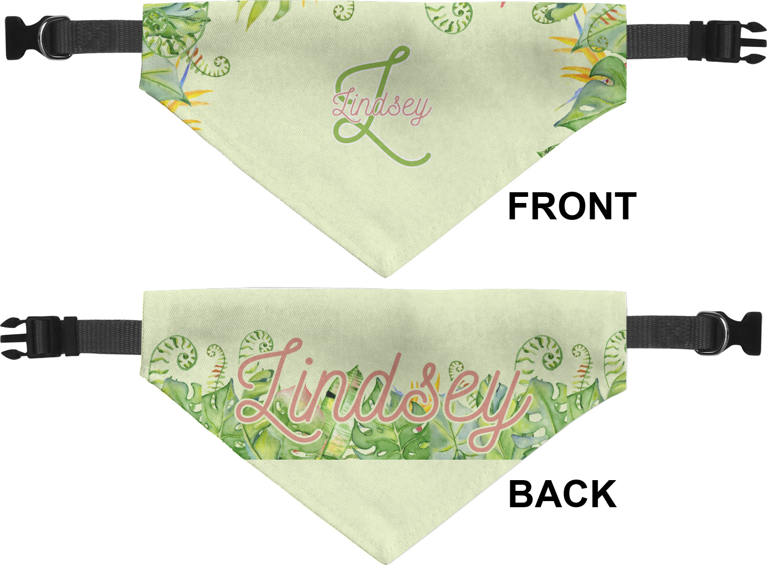 We print the front and back of these dog bandanas with your customized design. The bandana itself is made from a durable polyester, sewn together with a gap large enough to accommodate any collar. Regardless, the bandana includes a plain black, canvas collar with plastic snaps, that can easily be removed if desired. These dog bandana collars are available in four sizes: small, medium, large, and extra large. Please see our sizing chart for more information regarding the dimensions of each size.