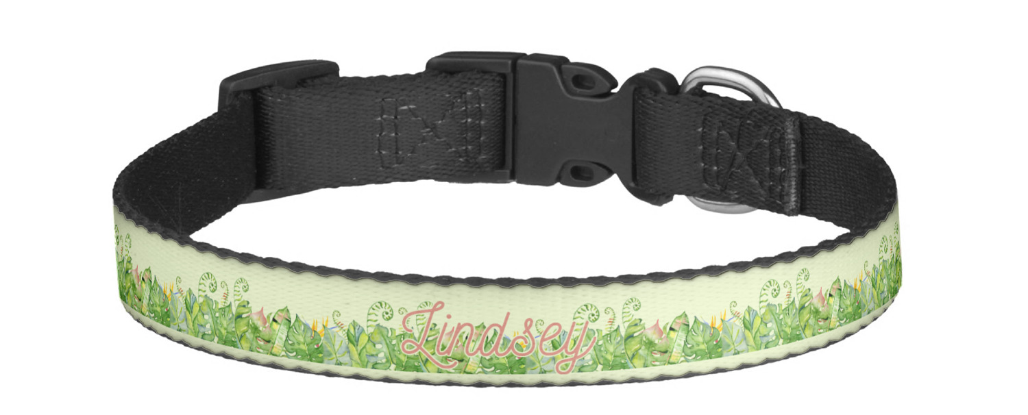 This sturdy collar, made from a durable nylon weave, will outlive your dog's episodes of excited tugging and pulling. Courtesy of its thick plastic buckle and adjuster, this collar is adjustable and accommodating of any dog. Structurally, the collar is a single piece of nylon weave that is sewn together, and features a solid metal loop where you can attach a leash or dog tag. We print and display your dog's name and pattern across the middle of the personalized dog collar.