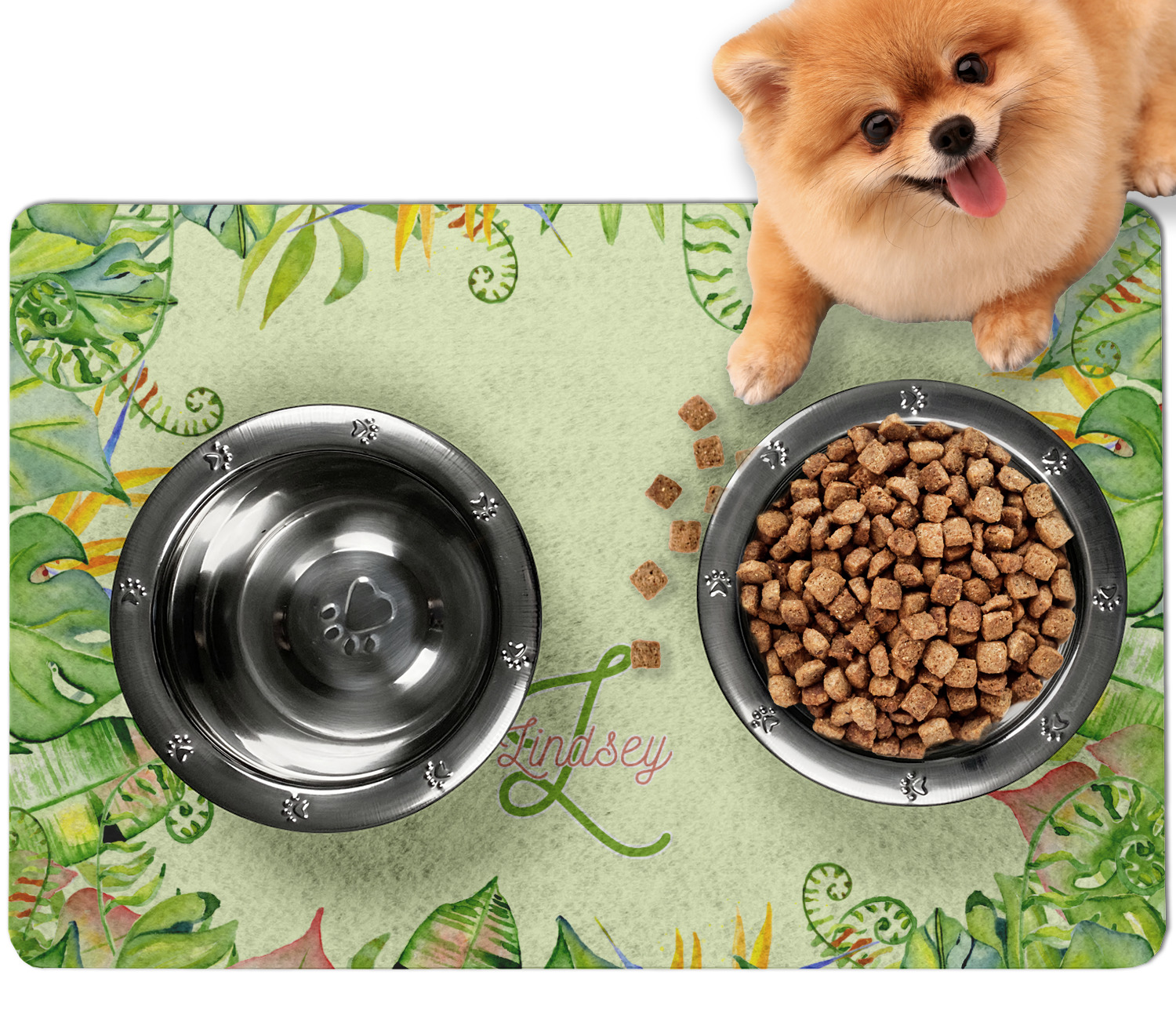 Frustrated with the mess your pets make during mealtime? Personalize a multi-functional dog food mat that prevents spills from reaching your floors, while also incorporating some cute decor to your dog's eating area!