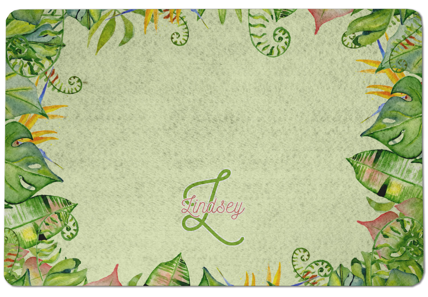 This design has a calming light green background. The foreground is filled with pops of dark green, lime, yellow, and a soft red. The tropical leaves really pop out at you as if they were real. The leaves are in a border or frame sort of formation surrounding a name and initial. This is a gorgeous design that looks a little bit different on each product it is on.