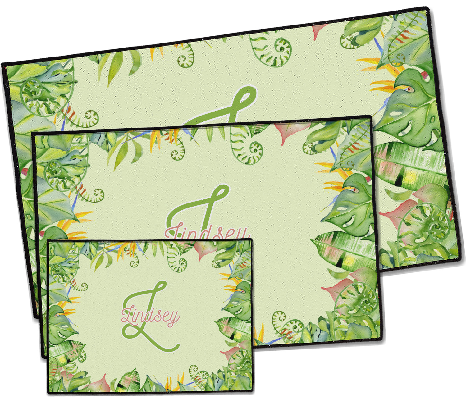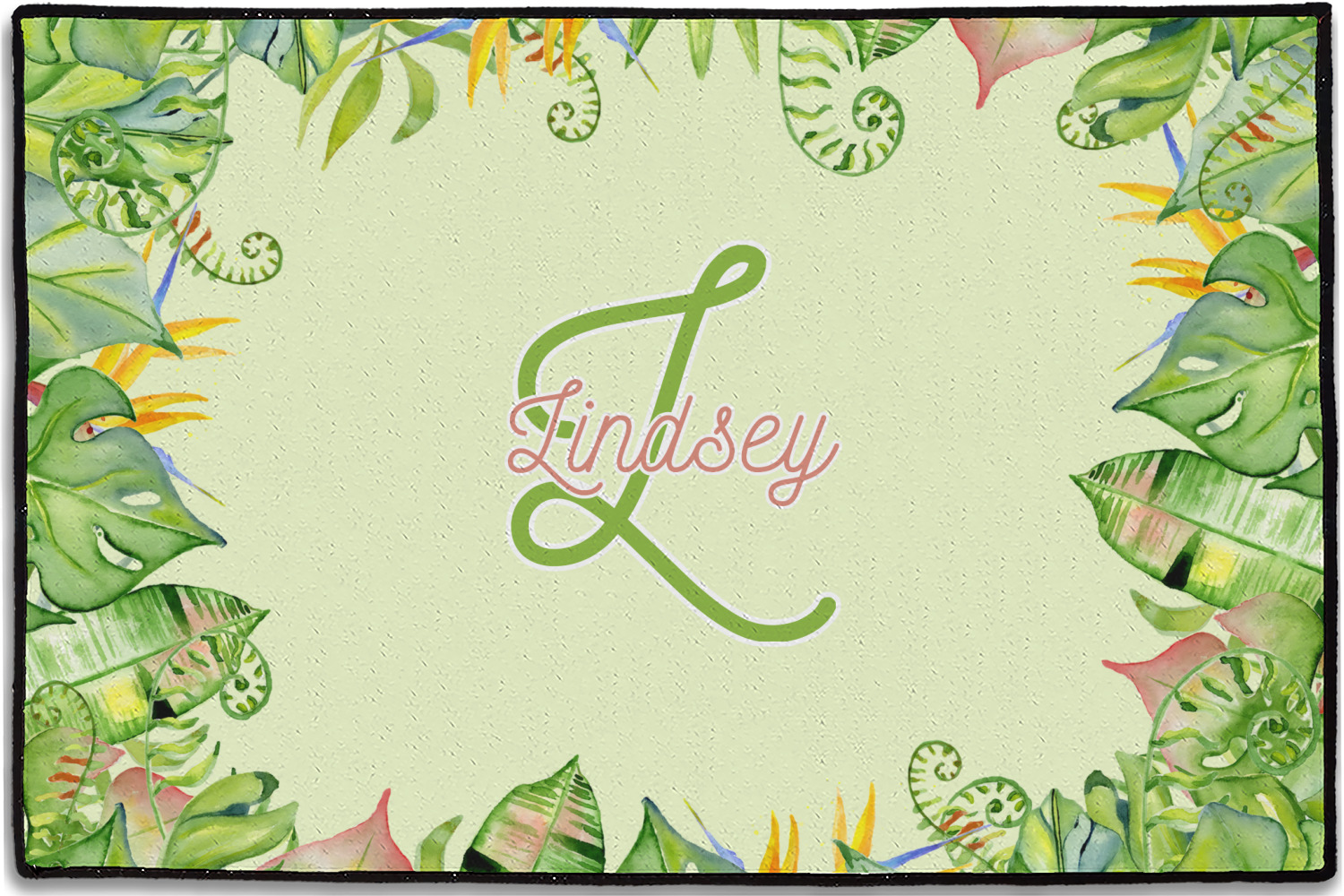 This design has a calming light green background. The foreground is filled with pops of dark green, lime, yellow, and a soft red. The tropical leaves really pop out at you as if they were real. The leaves are in a border or frame sort of formation surrounding a name and initial. This is a gorgeous design that looks a little bit different on each product it is on.