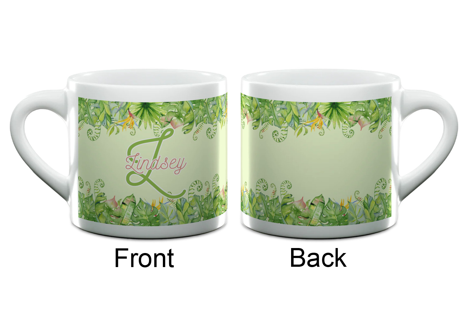 Each of our espresso mugs is a ceramic material sure to keep your drink warm. Personalize one cup for yourself, or order a set of 4! Its the perfect little gift for any coffee lover! We carry two sizes for you to personalize - 3 oz. (approx. 3.25" x 2.325" x 2.625") or 6 oz. (approx. 4" x 2.9" x 2.9"). Our 3 oz. mug is perfect for that single shot espresso while our 6 oz. mug can be your next favorite cappuccino cup holding two shots of espresso!