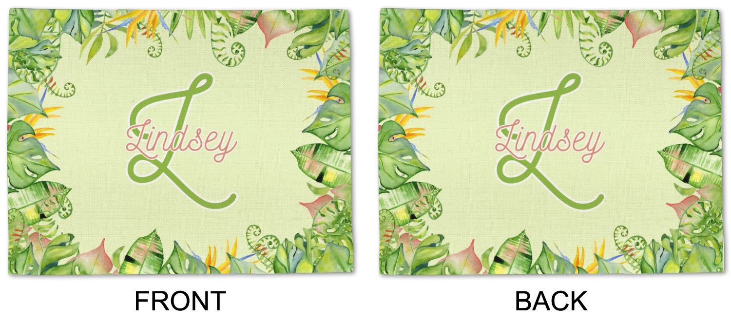 This design has a calming light green background. The foreground is filled with pops of dark green, lime, yellow, and a soft red. The tropical leaves really pop out at you as if they were real. The leaves are in a border or frame sort of formation surrounding a name and initial. This is a gorgeous design that looks a little bit different on each product it is on.