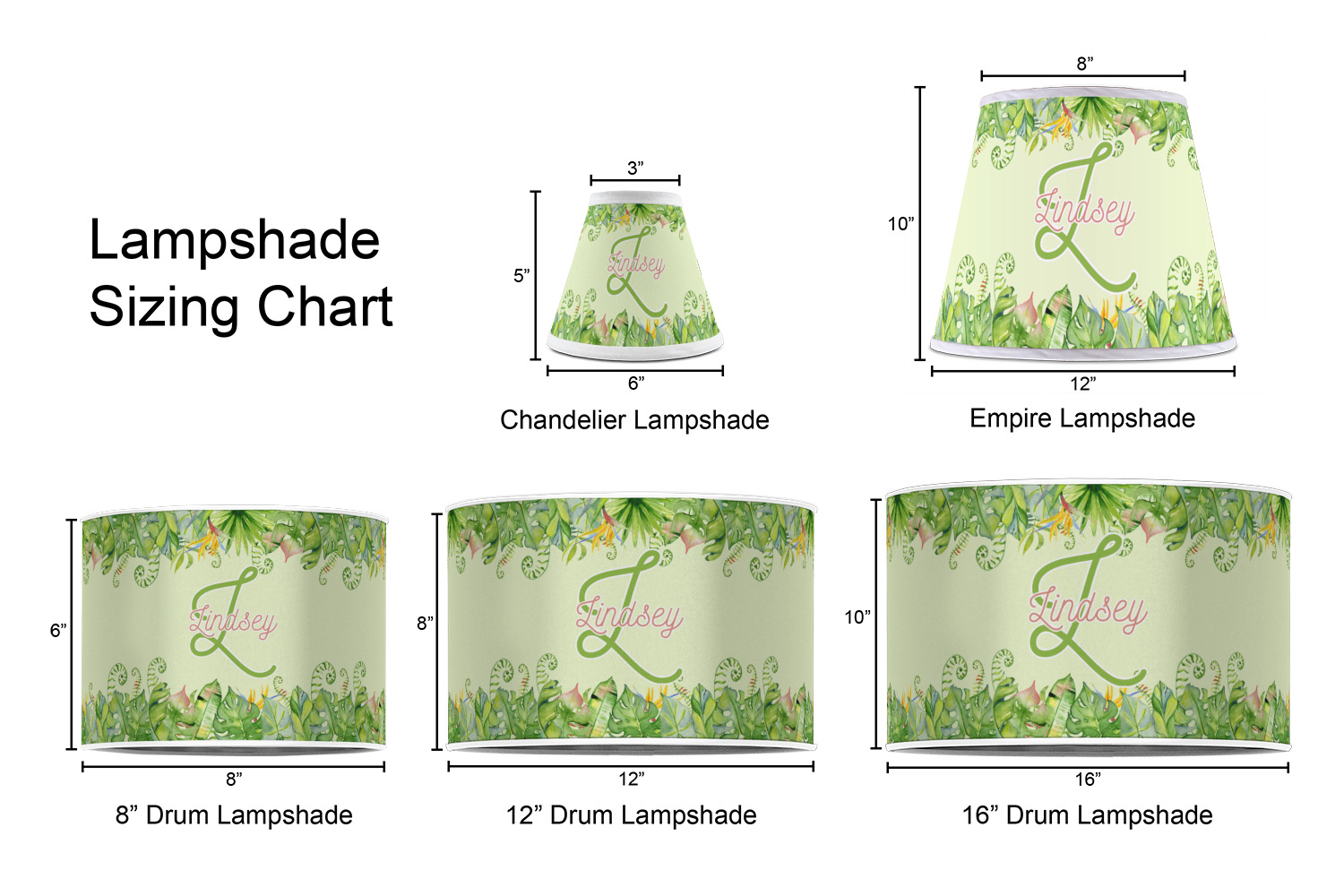 Our customized lamp shades also come in 3 different sizes: 8", 12" and 16", measuring at 8" in diameter by 6" tall, 12" in diameter by 8" tall, and 16" in diameter by 10" tall, respectively.