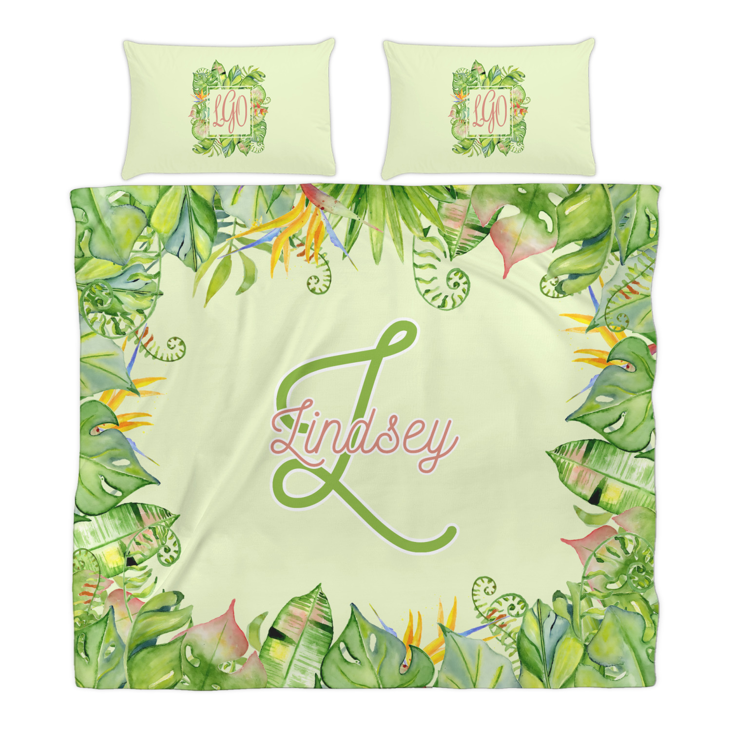 This design has a calming light green background. The foreground is filled with pops of dark green, lime, yellow, and a soft red. The tropical leaves really pop out at you as if they were real. The leaves are in a border or frame sort of formation surrounding a name and initial. This is a gorgeous design that looks a little bit different on each product it is on.