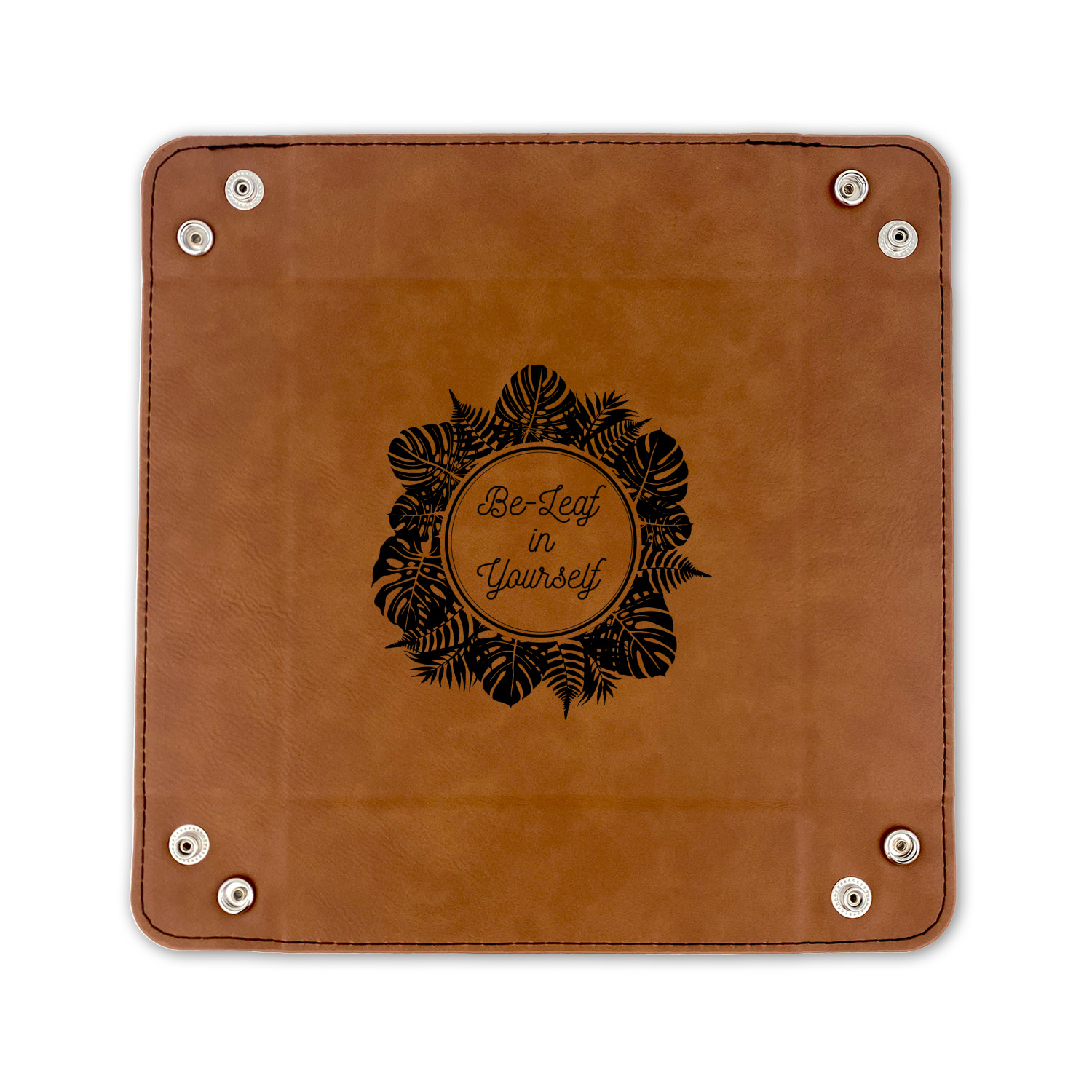 The leatherette wraps the hard board base and sides with flexible hinges to fold the sides up. The corners are secured using silver snaps. The 6in x 6 in tray measures approximately 9.5in x 9.5in when laid flat. The 9in x 9in tray measures approximately 13in x 13in when laid flat.