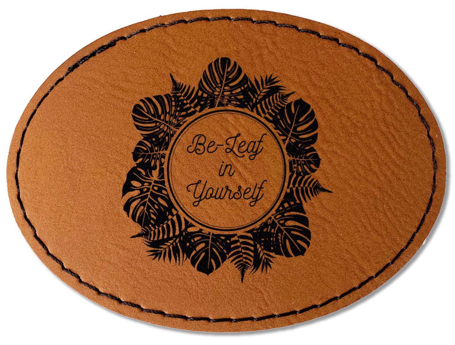 Our leather patches come in 4 different shapes - Square (3" x 3"), Round (3" x 3"), Oval (3.5" x 2.5"), Rectangle (3.5" x 2.5") and a beautiful rich brown rawhide or cognac color.