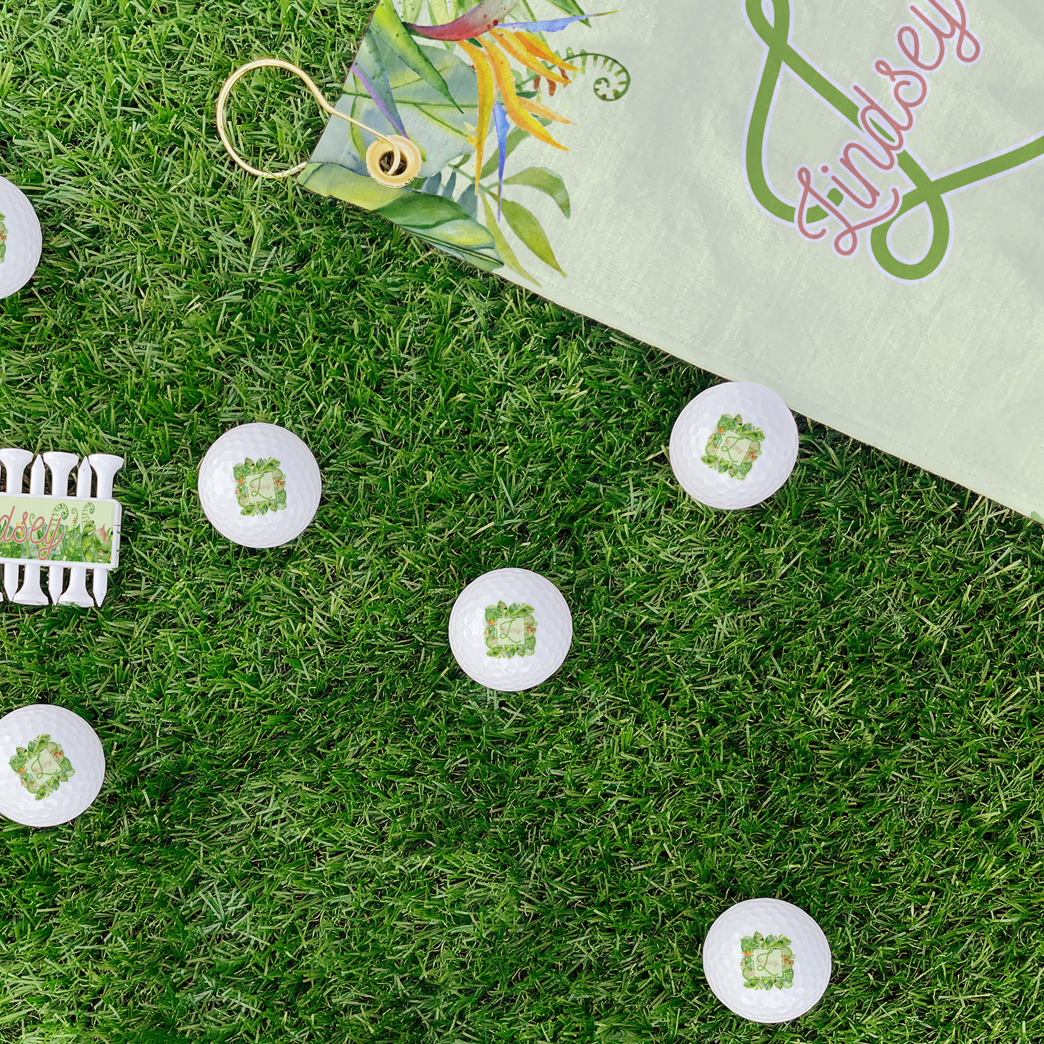 This design has a calming light green background. The foreground is filled with pops of dark green, lime, yellow, and a soft red. The tropical leaves really pop out at you as if they were real. The leaves are in a border or frame sort of formation surrounding a name and initial. This is a gorgeous design that looks a little bit different on each product it is on.
