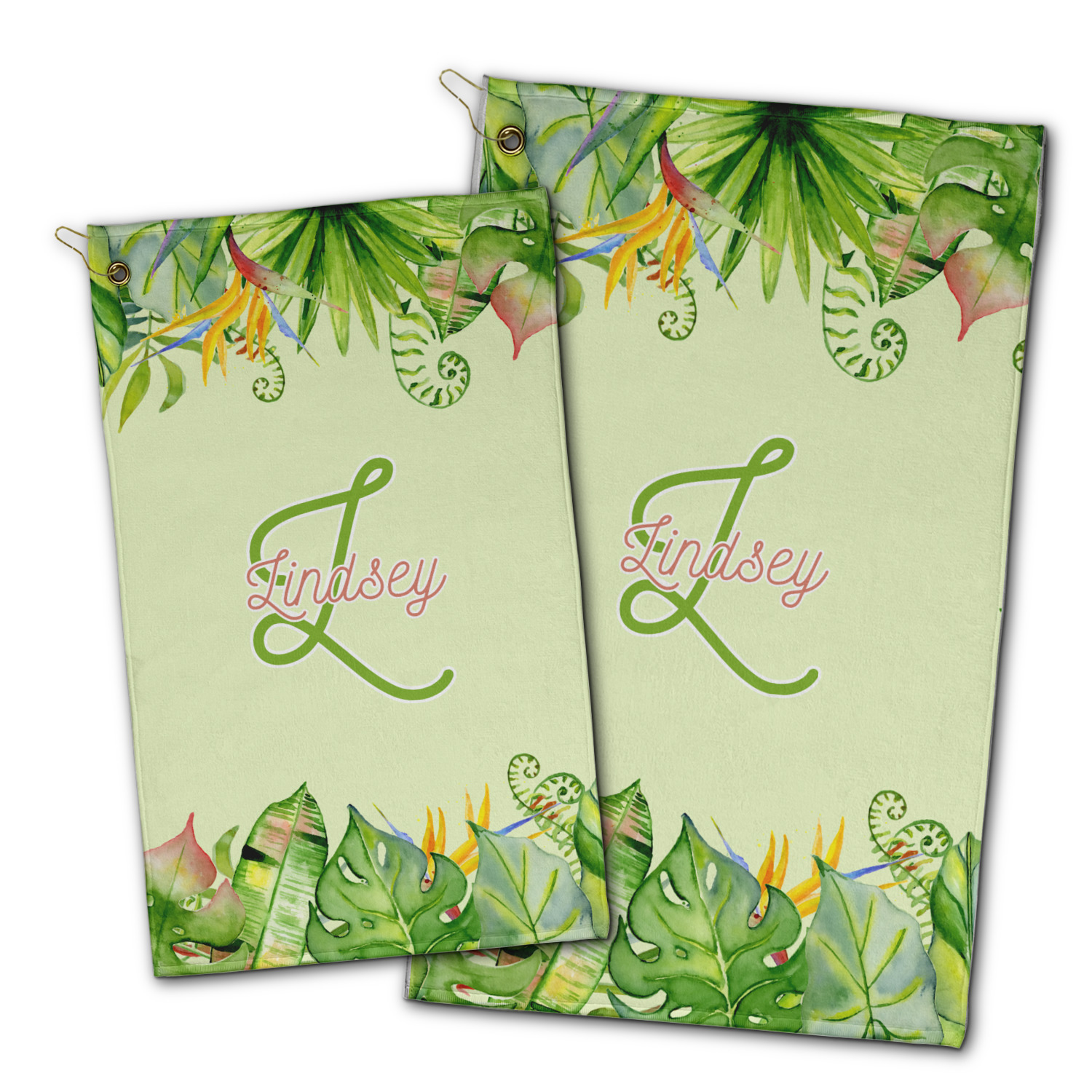 This design has a calming light green background. The foreground is filled with pops of dark green, lime, yellow, and a soft red. The tropical leaves really pop out at you as if they were real. The leaves are in a border or frame sort of formation surrounding a name and initial. This is a gorgeous design that looks a little bit different on each product it is on.