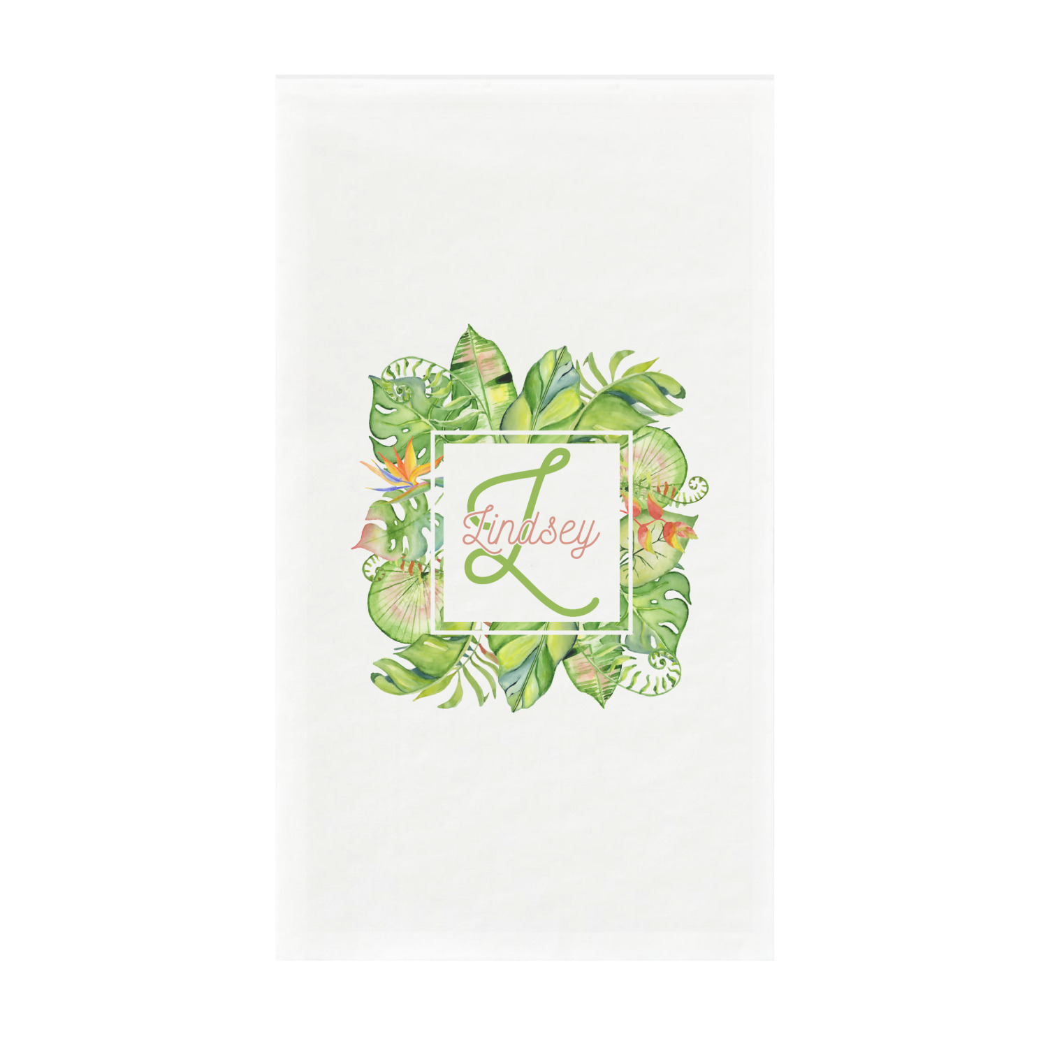 This design has a calming light green background. The foreground is filled with pops of dark green, lime, yellow, and a soft red. The tropical leaves really pop out at you as if they were real. The leaves are in a border or frame sort of formation surrounding a name and initial. This is a gorgeous design that looks a little bit different on each product it is on.