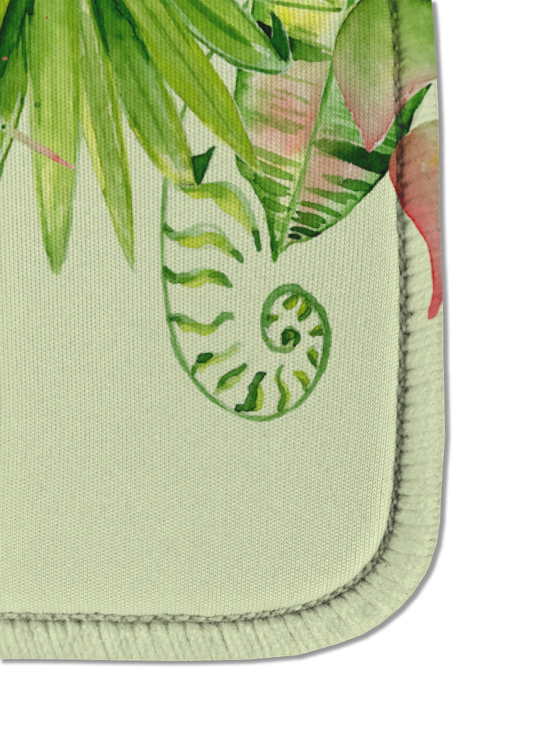 This design has a calming light green background. The foreground is filled with pops of dark green, lime, yellow, and a soft red. The tropical leaves really pop out at you as if they were real. The leaves are in a border or frame sort of formation surrounding a name and initial. This is a gorgeous design that looks a little bit different on each product it is on.