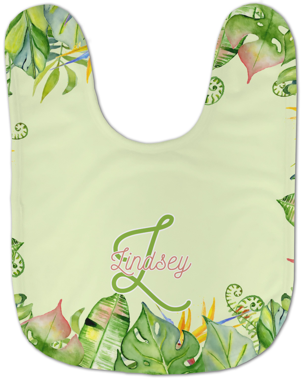 This design has a calming light green background. The foreground is filled with pops of dark green, lime, yellow, and a soft red. The tropical leaves really pop out at you as if they were real. The leaves are in a border or frame sort of formation surrounding a name and initial. This is a gorgeous design that looks a little bit different on each product it is on.