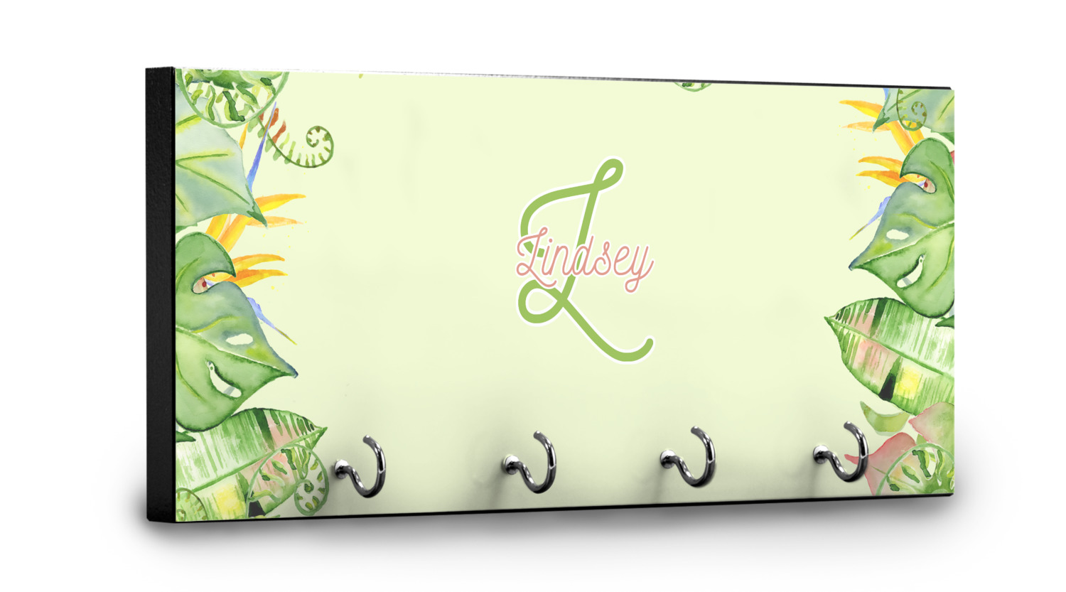 This design has a calming light green background. The foreground is filled with pops of dark green, lime, yellow, and a soft red. The tropical leaves really pop out at you as if they were real. The leaves are in a border or frame sort of formation surrounding a name and initial. This is a gorgeous design that looks a little bit different on each product it is on.