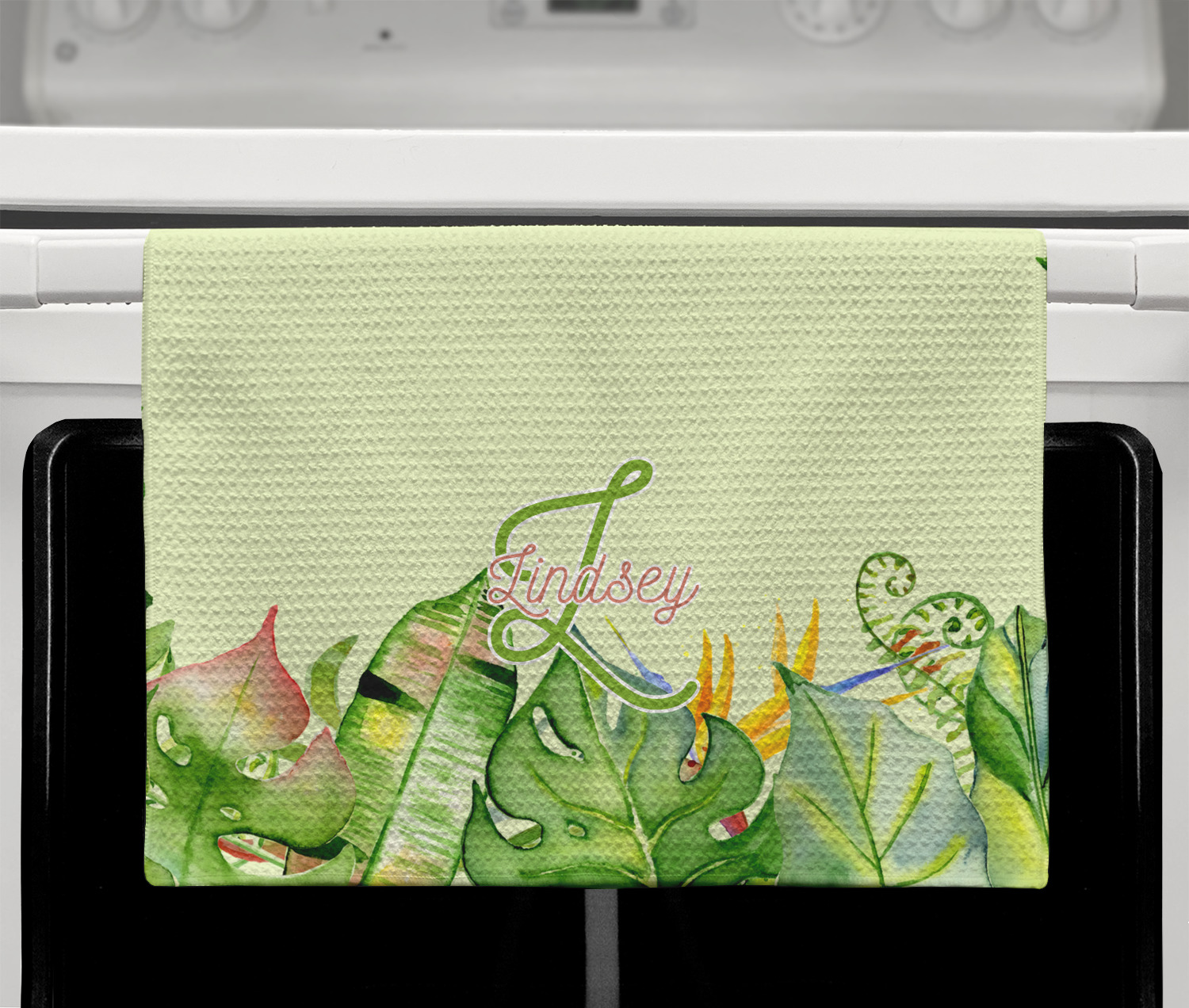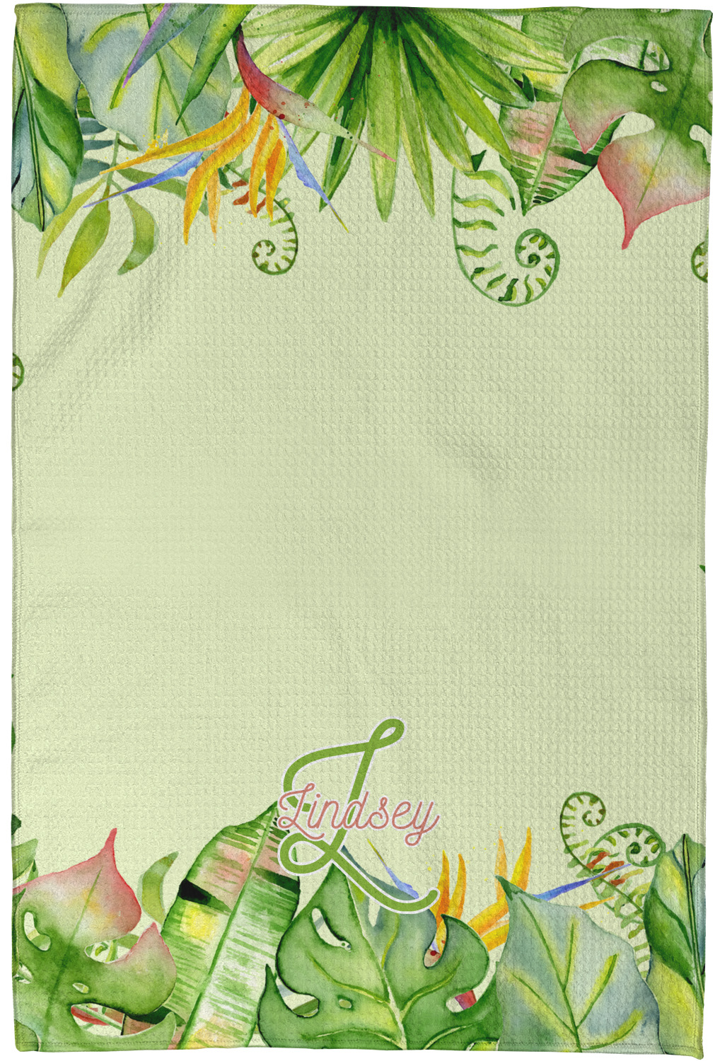 This design has a calming light green background. The foreground is filled with pops of dark green, lime, yellow, and a soft red. The tropical leaves really pop out at you as if they were real. The leaves are in a border or frame sort of formation surrounding a name and initial. This is a gorgeous design that looks a little bit different on each product it is on.