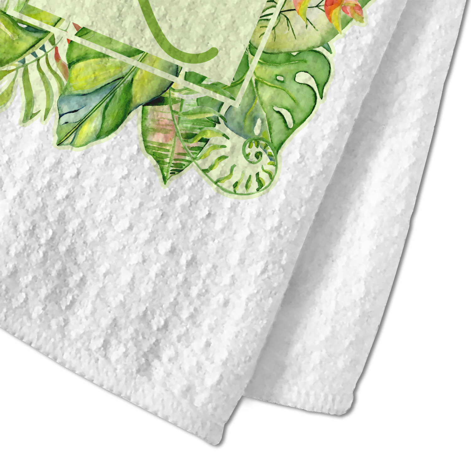 This design has a calming light green background. The foreground is filled with pops of dark green, lime, yellow, and a soft red. The tropical leaves really pop out at you as if they were real. The leaves are in a border or frame sort of formation surrounding a name and initial. This is a gorgeous design that looks a little bit different on each product it is on.