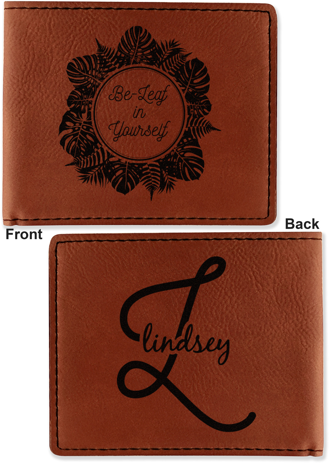 Your bifold wallet will be personalized by laser engraving, which will be a black color on the wallet. Choose a graphic, text, or monogram to personalize your wallet. There are thousands of choices in our design center.