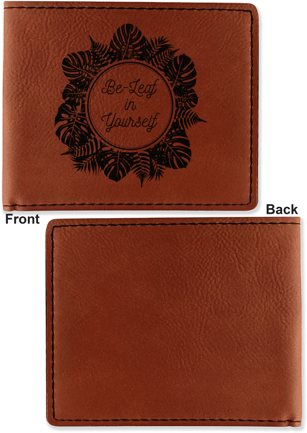 Your bifold wallet will be personalized by laser engraving, which will be a black color on the wallet. Choose a graphic, text, or monogram to personalize your wallet. There are thousands of choices in our design center.
