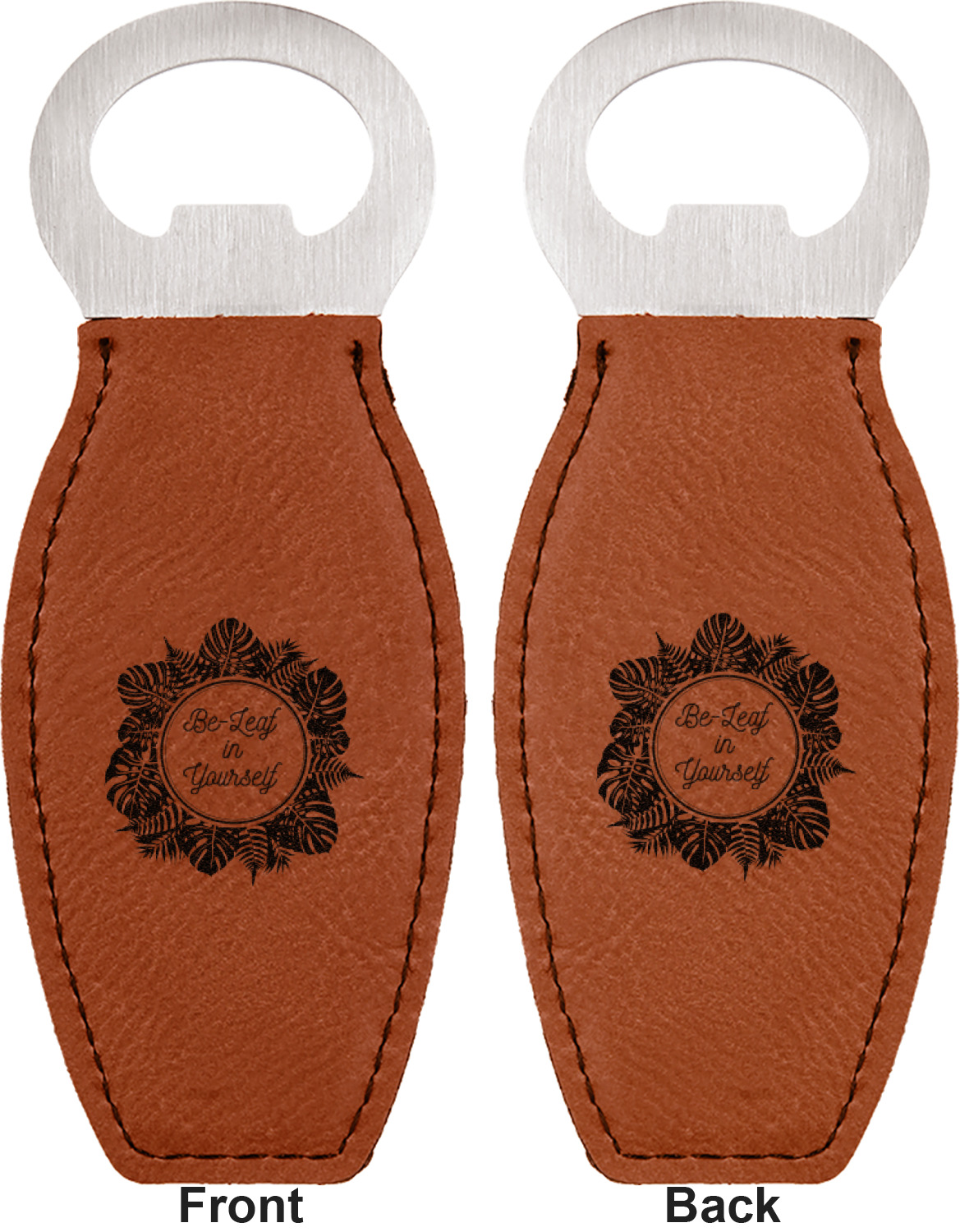 Built from stainless steel, these custom bottle openers are wrapped in a cognac-colored leatherette. Sharp, black stitching lines the edges for extra durability and a finished touch. Your personalization is laser-engraved onto the surface of this leatherette, leaving behind a crisp, black coloration. At 4.6 by 1.8 inches, this beer bottle opener gives you much of leverage when trying to open a stubborn bottle. On the opposite end of the opener, you'll find a magnet that you can use to display your new, unique bottle opener!