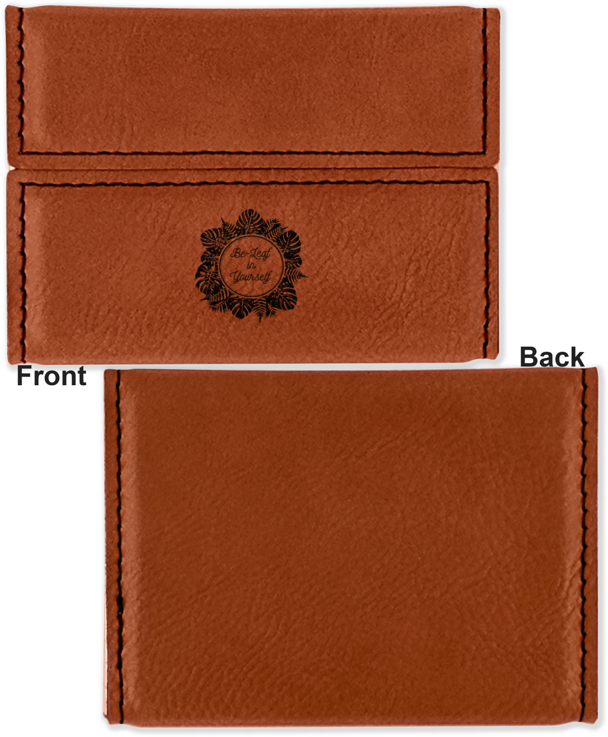 Your personalized design is laser engraved onto either the front, or the front and back of the card holder, depending on the model you purchase. Once engraved, the design will appear a darkened black against the cognac color of the leatherette.