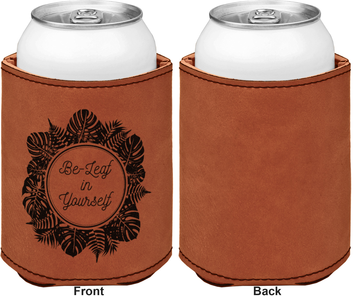 This can sleeve is made from a cognac-brown leatherette and stitched with a sturdy, black thread. A slim padding lines the inside of your can sleeve to allow for a better fit once your drink is inserted. The sleeve itself measures at 4 by 4.5 inches, allowing this custom can sleeve to accommodate most canned drinks. Your personalized design can be engraved on the front and back, or solely the front. When laser-engraved, your design appears as a black coloration which contrasts the leatherette nicely.