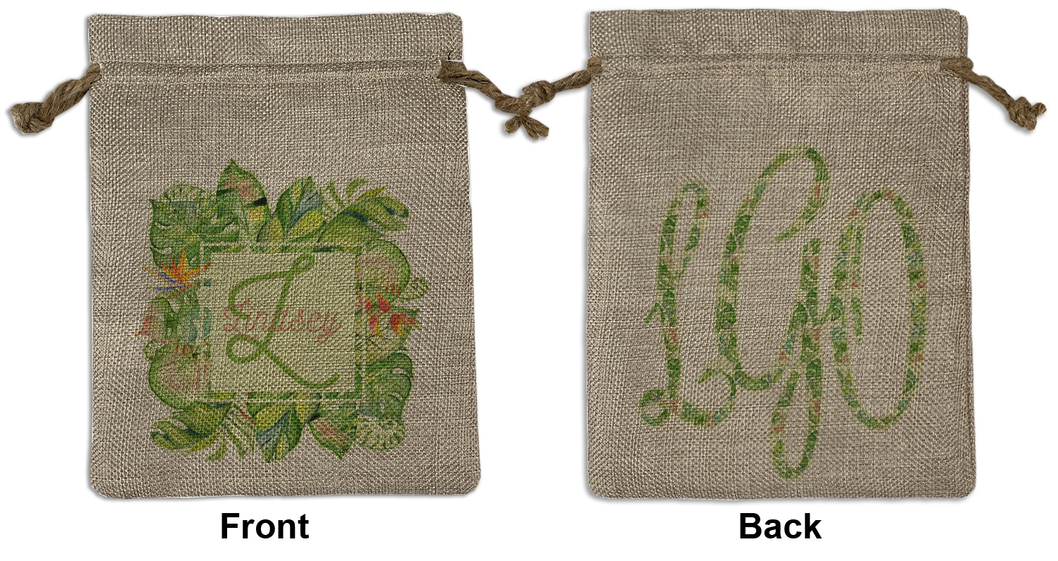 We sell our Burlap Gift Bags in 3 variant sized bags. Made with burlap polyester, each personalized bag can be secured with a twine drawstring pull. Your custom design is available to print on one side or both sides - completely up to you! The sizes of the bags measure approximately 4.5" x 6.5" for the smallest size, 6.5" x 8.0" for the medium size, and 6.5" x 13.5" for the large-sized bag.