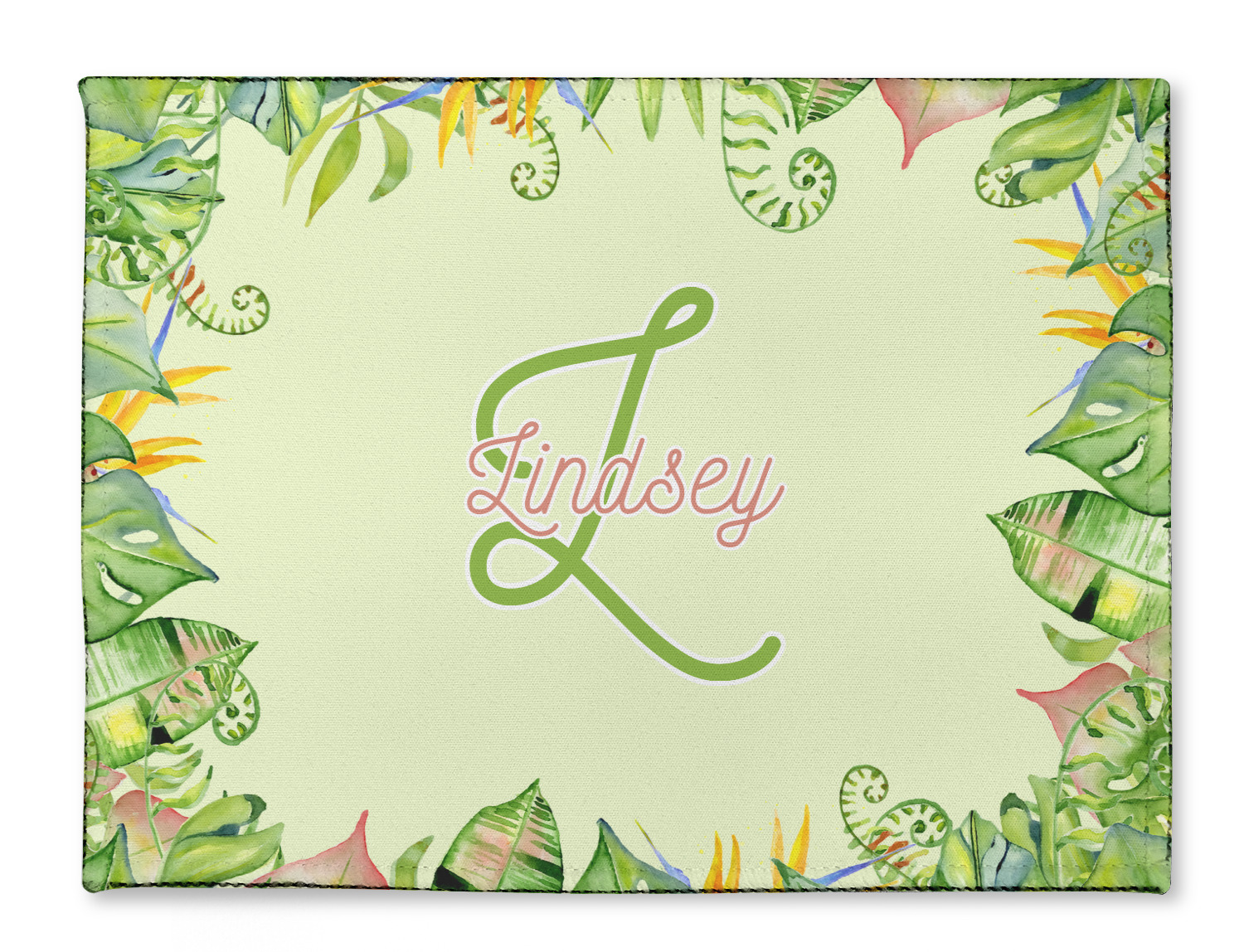This design has a calming light green background. The foreground is filled with pops of dark green, lime, yellow, and a soft red. The tropical leaves really pop out at you as if they were real. The leaves are in a border or frame sort of formation surrounding a name and initial. This is a gorgeous design that looks a little bit different on each product it is on.