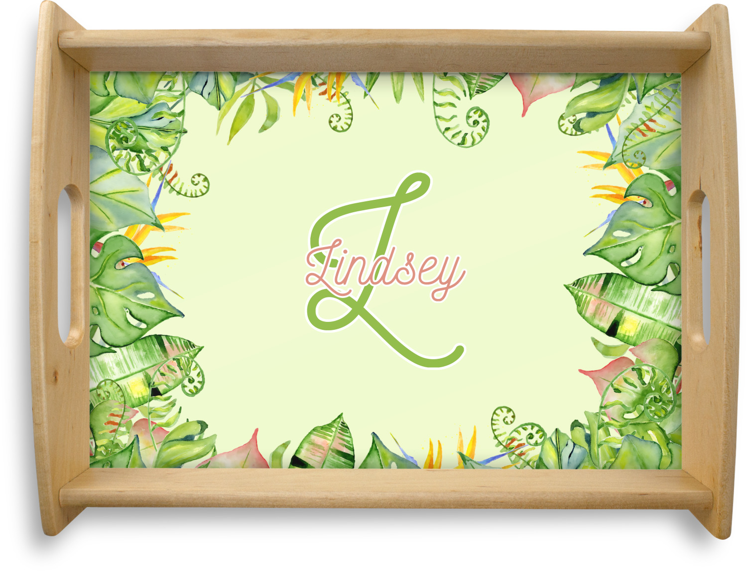 This design has a calming light green background. The foreground is filled with pops of dark green, lime, yellow, and a soft red. The tropical leaves really pop out at you as if they were real. The leaves are in a border or frame sort of formation surrounding a name and initial. This is a gorgeous design that looks a little bit different on each product it is on.