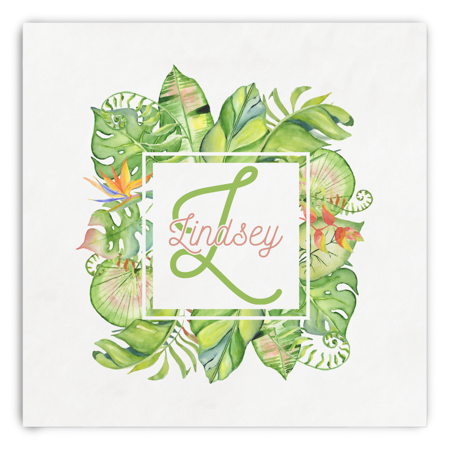 This design has a calming light green background. The foreground is filled with pops of dark green, lime, yellow, and a soft red. The tropical leaves really pop out at you as if they were real. The leaves are in a border or frame sort of formation surrounding a name and initial. This is a gorgeous design that looks a little bit different on each product it is on.