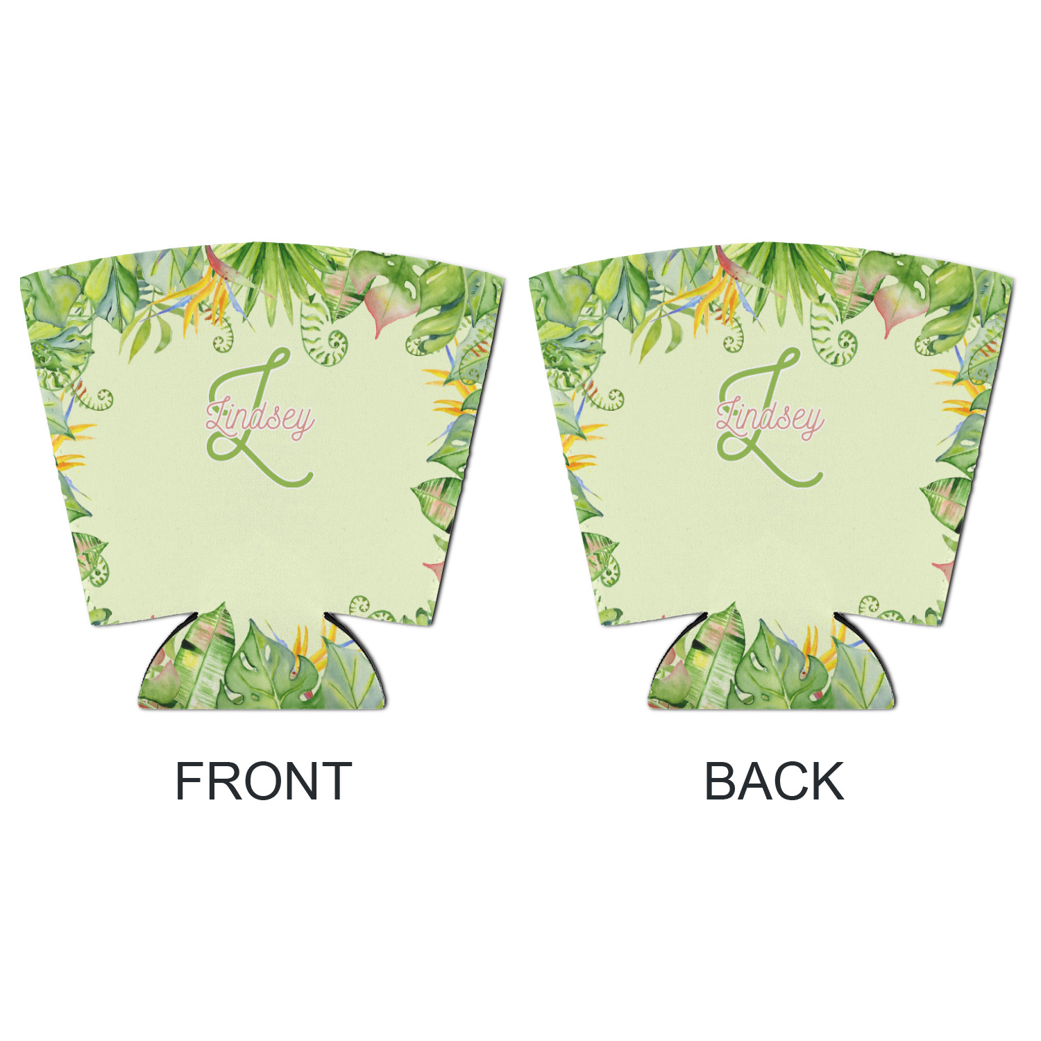This design has a calming light green background. The foreground is filled with pops of dark green, lime, yellow, and a soft red. The tropical leaves really pop out at you as if they were real. The leaves are in a border or frame sort of formation surrounding a name and initial. This is a gorgeous design that looks a little bit different on each product it is on.