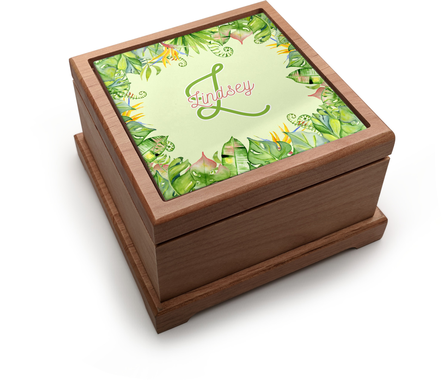 This design has a calming light green background. The foreground is filled with pops of dark green, lime, yellow, and a soft red. The tropical leaves really pop out at you as if they were real. The leaves are in a border or frame sort of formation surrounding a name and initial. This is a gorgeous design that looks a little bit different on each product it is on.