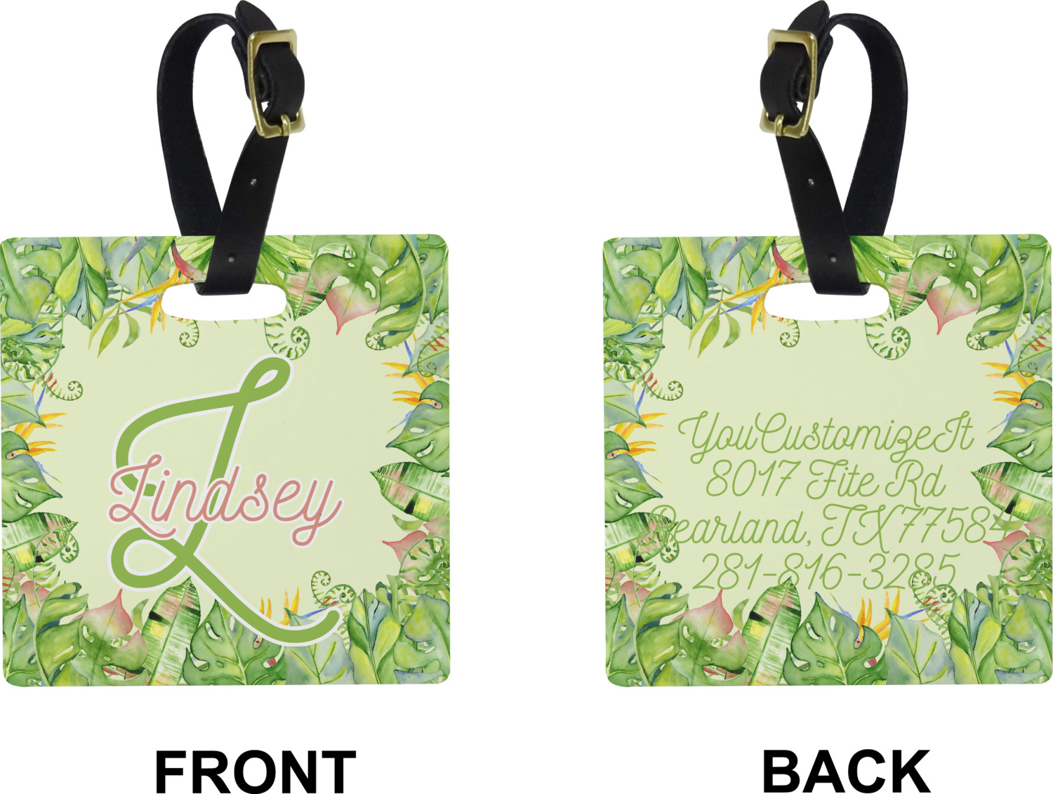 These personalized bag tags are sold in a variety of shapes, so that you may find the product that meets your vision exactly. We sell a round luggage tag, which measures at approximately 4" x 4". Our square luggage tag is about 3.5" x 3.5", while our rectangular version is 2.75" x 4 ".
