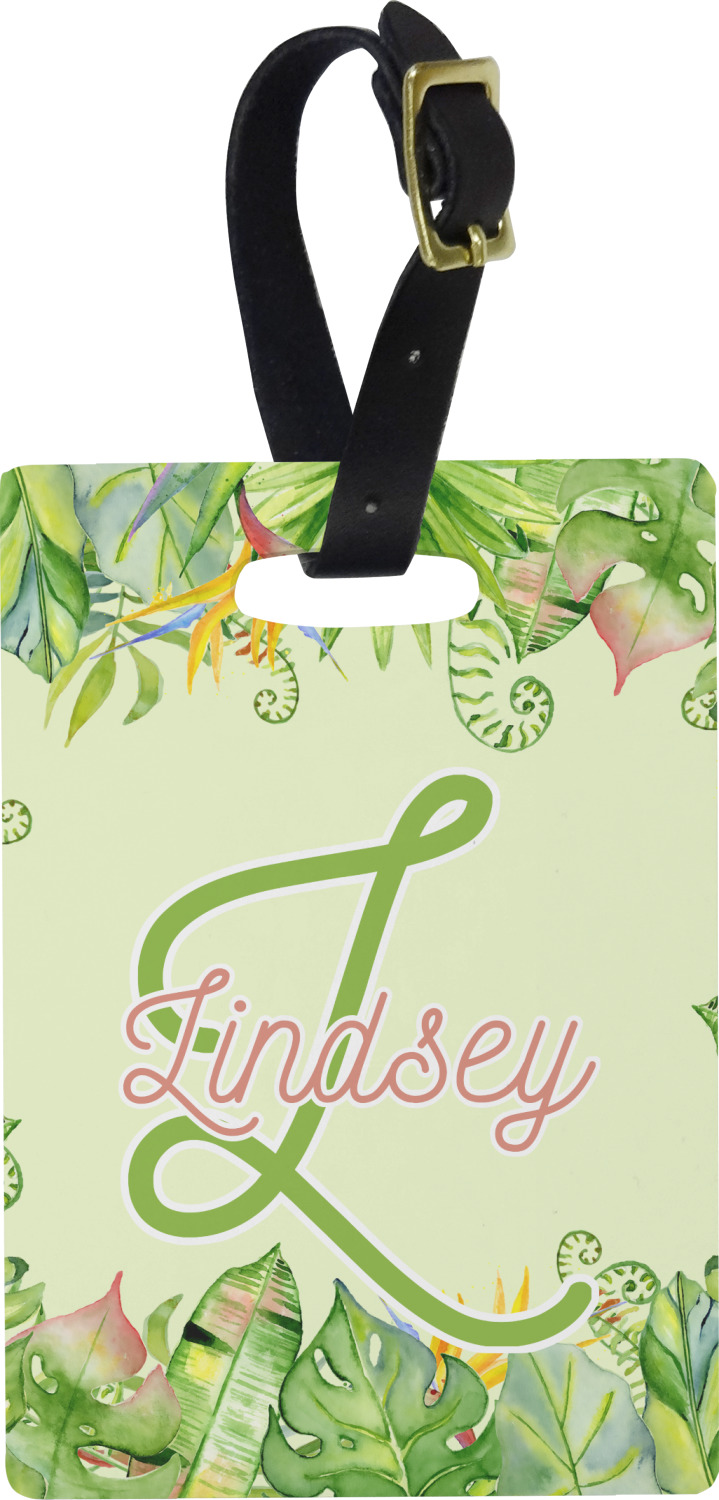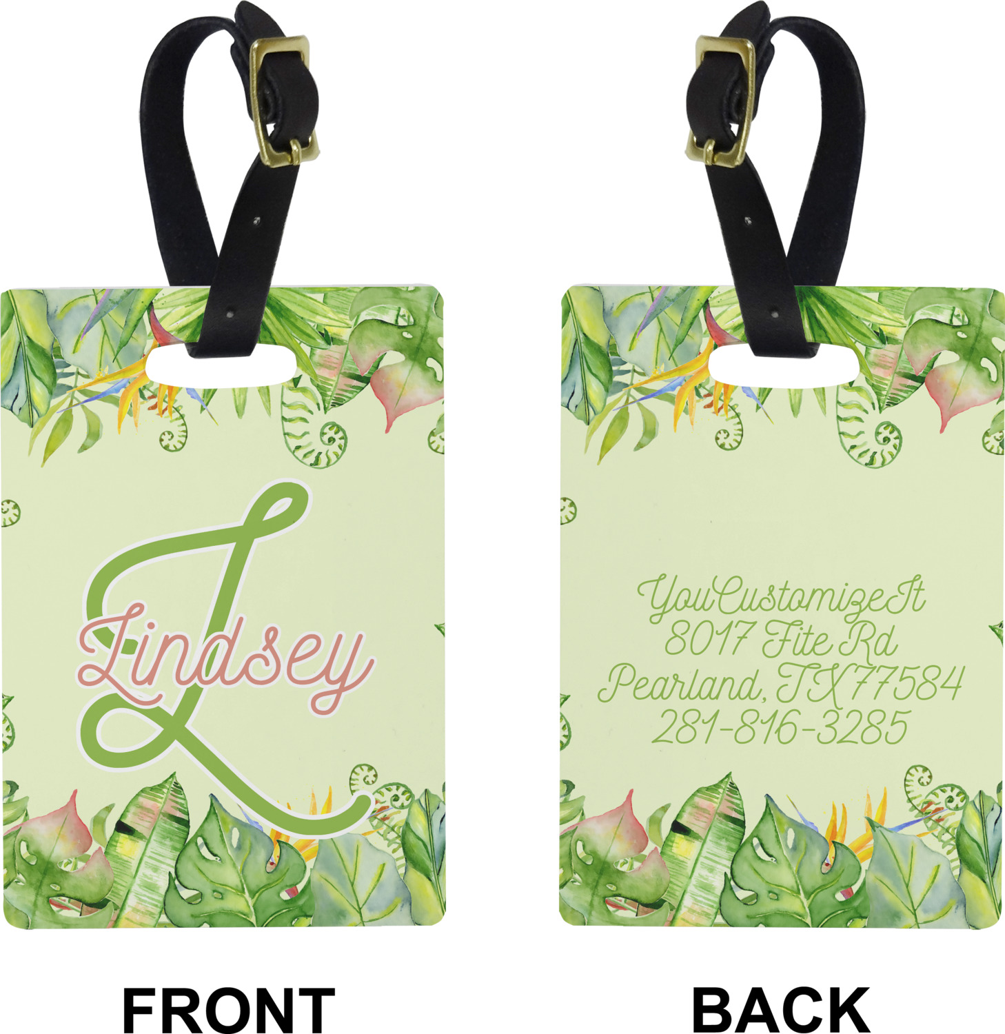 These personalized bag tags are sold in a variety of shapes, so that you may find the product that meets your vision exactly. We sell a round luggage tag, which measures at approximately 4" x 4". Our square luggage tag is about 3.5" x 3.5", while our rectangular version is 2.75" x 4 ".
